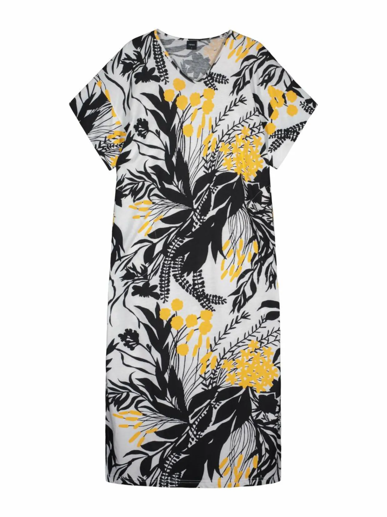 Naisten kuosillinen Puutarha-yömekko v-pääntiellä. Lyhythihaisessa kaftaanissa on sivutaskut ja sivuhalkiot. Materiaali on laadukasta, iholla miellyttävän pehmeältä tuntuvaa ja helppohoitoista puuvilla-modaalia, joka pysyy hyvänä pesusta toiseen.