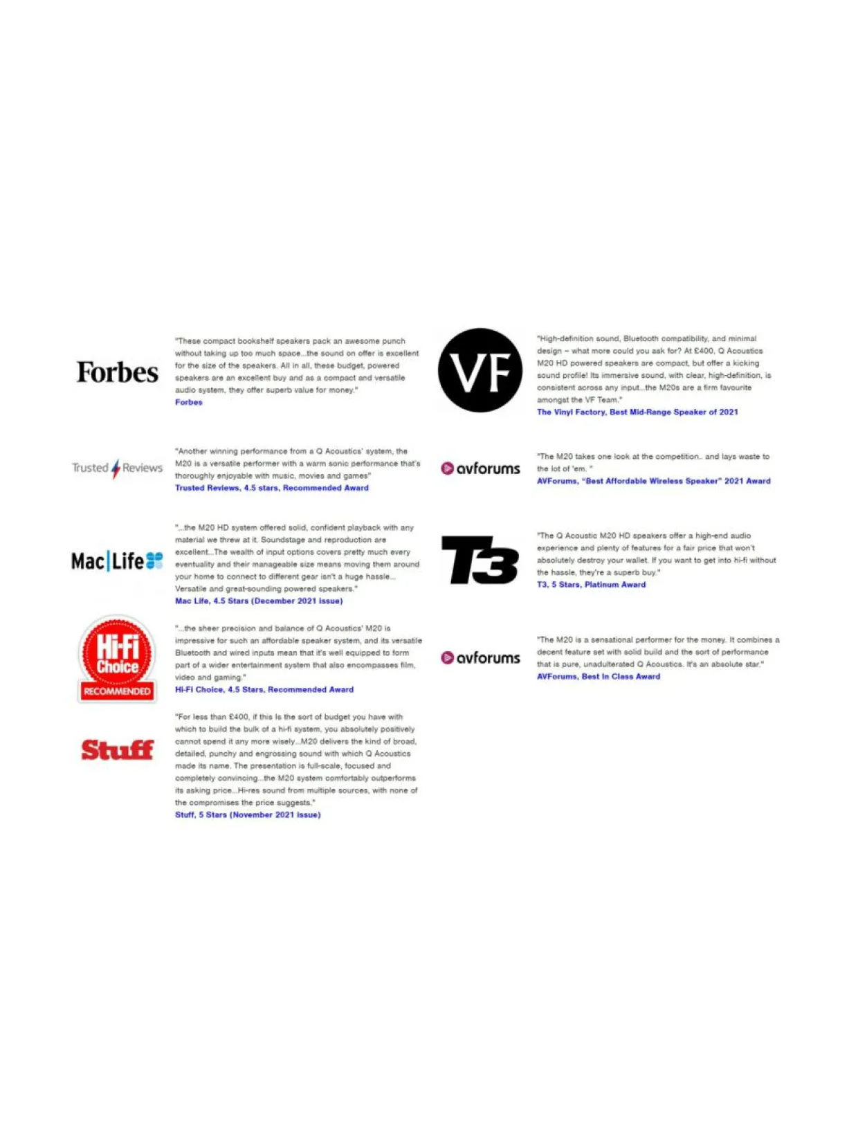 Bluetooth® 5.0 takaa erittäin vakaan yhteyden ja puhtaasti soivan aptX™ HD -tekniikan, joten käyttäjät voivat suoratoistaa langattomasti korkearesoluutioista ääntä (jopa 24-bit/48kHz) mistä tahansa yhteensopivasta laitteesta, kuten älypuhelimesta, tabletista, kannettavasta tietokoneesta tai verkkostriimaussoittimesta. Musiikkia voi näinollen striimata esimerkiksi suosituista musiikkipalveluista, kuten Spotify, Tidal, Deezer, Apple Music, Amazon Music ja Qobuz. M20:ssä on tarpeeksi tuloja, jotta televisiosi, pelikonsolisi, digisovittimesi, levysoittimesi tai jotakuinkin mikä tahansa muu haluamasi lähde voi liittyä korkearesoluutioiseen stereokokemukseen. Kaiuttimessa on myös subwoofer-lähtö siltä varalta, että haluat todella ravistella kuunteluhuonetta.