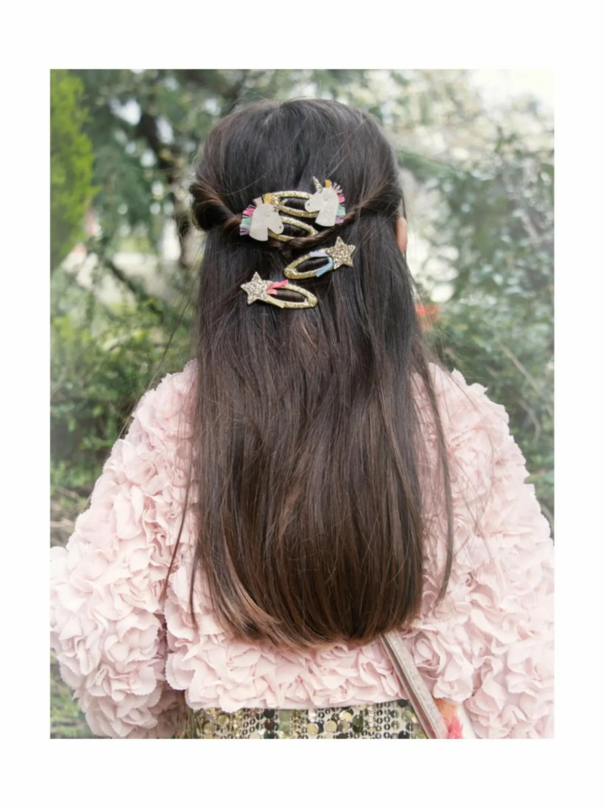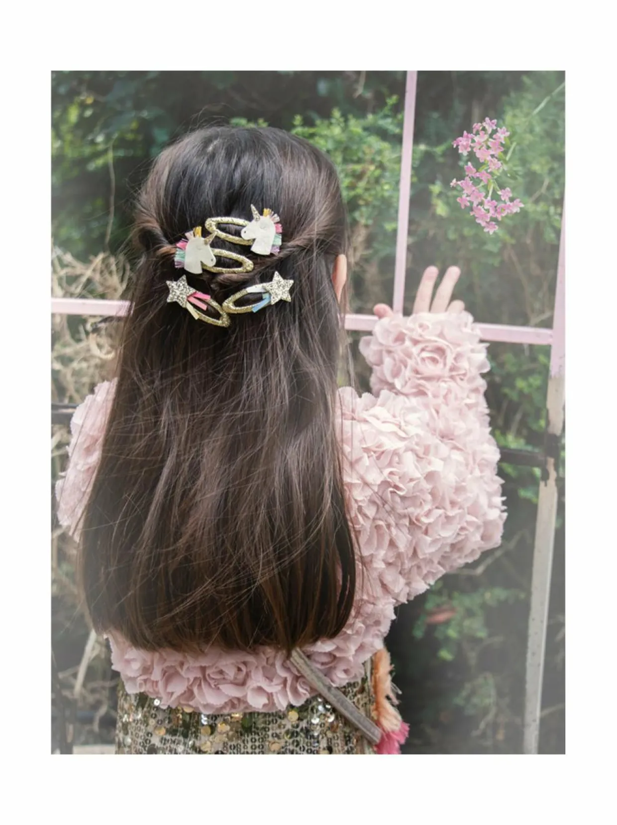 Rockahulan yksisarvisen aiheinen hiuspinnisetti. Hiuskoristeet ovat kääritty nauhaan lisäämään pehmeyttä. Pakkauksesta löydät kaksi hiuspinniä. Ei sovellu alle 36 kuukauden ikäisille lapsille.
