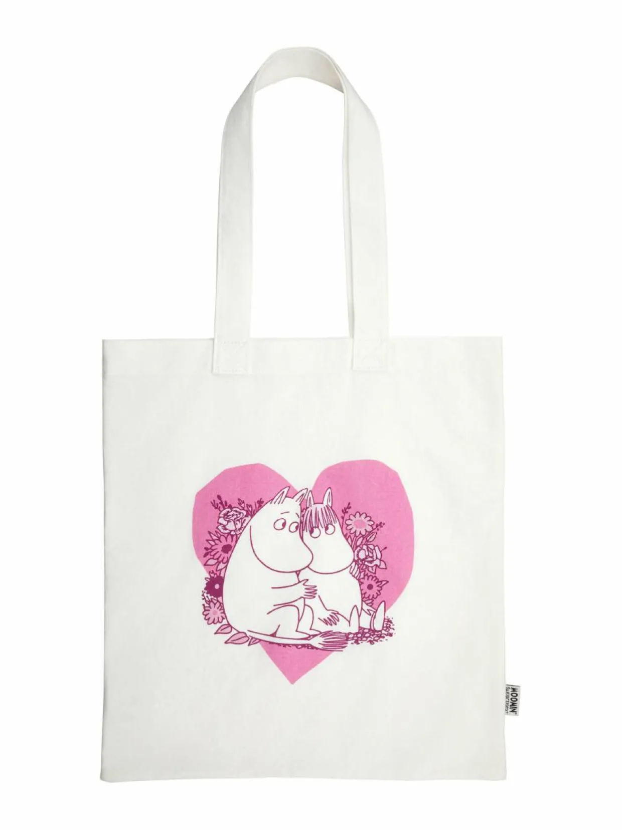 Kätevä tote-mallinen Muumi-ostoskassi, jossa on vahvat kantokahvat. Se on valmistettu kokonaan kierrätetystä puuvillasta ja tämä ekokassi kuuluu Ystävänpäivä-mallistoon. Mitat: 37 x 41 cm.