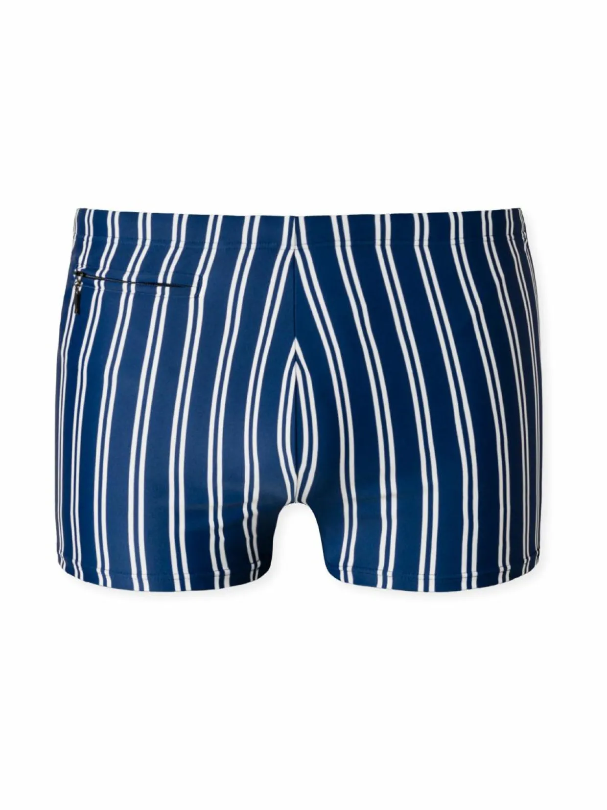Retro-henkiset raidalliset uimahousut. Edessä on yksi vetoketjullinen tasku, johon mahtuvat esim. avaimet.