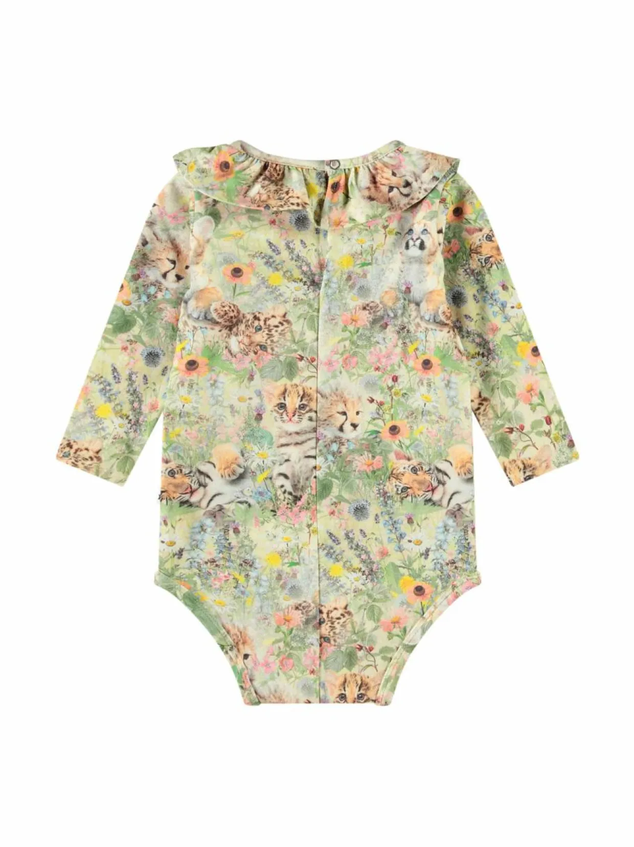 Molo-merkin pitkähihainen Rfeya-body on valmistettu pehmeästä ja mukavasta materiaalista. Siinä on kaunis, rypytetty kaulus ja eläinaiheinen kuvio. Se on valmistettu 95 % luomupuuvillasta ja 5 % elastaanista. Bodyssa on nepparit haaroissa ja selässä. Se on helppo pukea ja riisua. Body on ihanteellinen vauvoille ja pienille lapsille. Se on mukava ja käytännöllinen vaate sekä myös erinomainen lahjaidea.