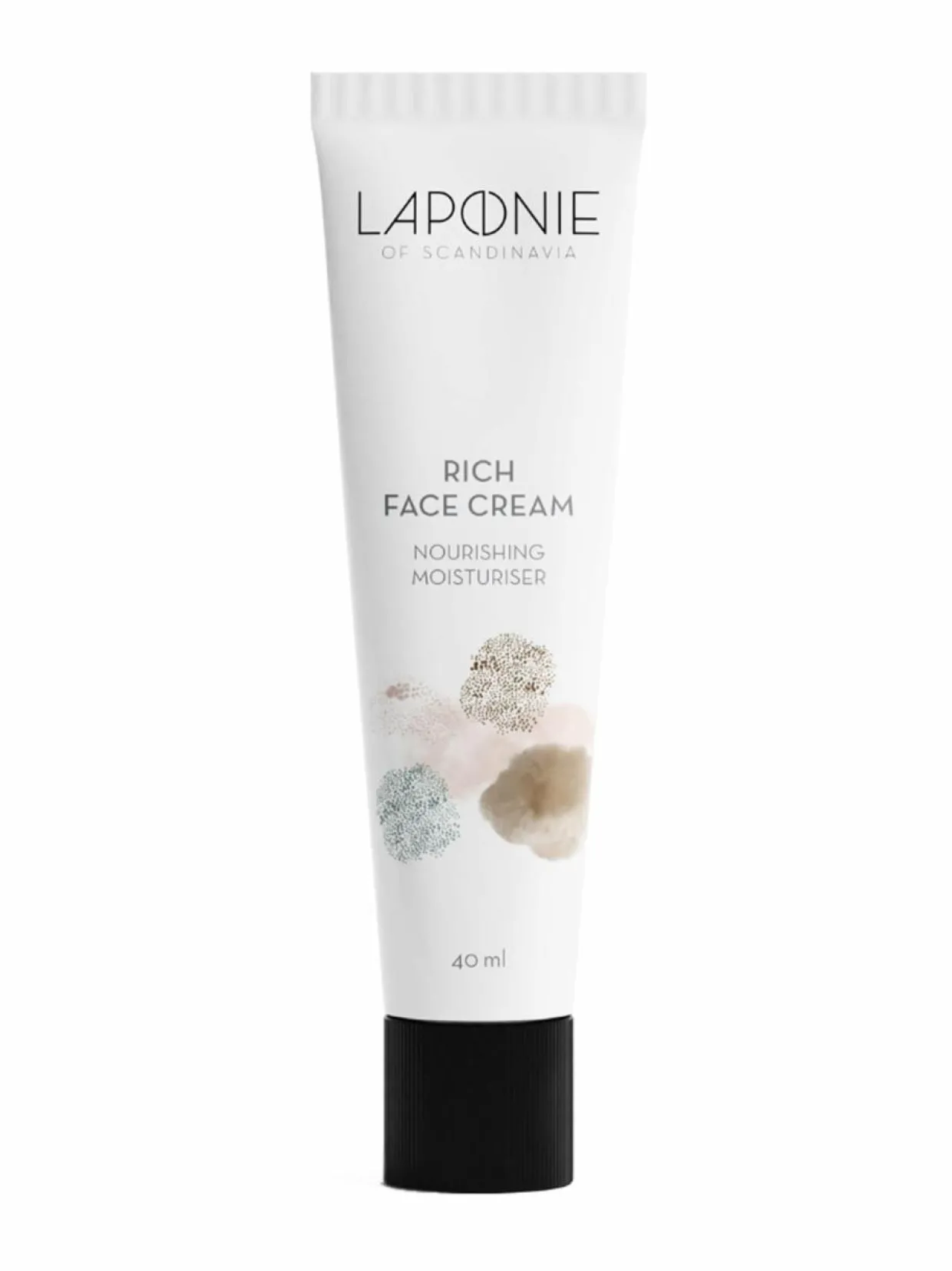 Laponien Rich Face Cream -kosteusvoide on täyteläinen, ravitseva ja kosteuttava voide, joka on tuhdimpi versio suositusta Light Face Cream –voiteesta.Rich Face Cream -voide ei jätä rasvaista ihotuntumaa ja kosteusvoide imeytyy nopeasti. Ruotsalainen kosmetiikkalaatuinen rypsiöljy ja sivuvirtana tuotettu Fazerin suomalainen kauraöljy pehmentävät ja hoitavat, klassikkohumektantit glyseriini ja sodium PCA kosteuttavat, ja kolloidinen kaurajauhe estää veden haihtuimisen, jättäen kosteutetun ja ravitun tunteen iholle.