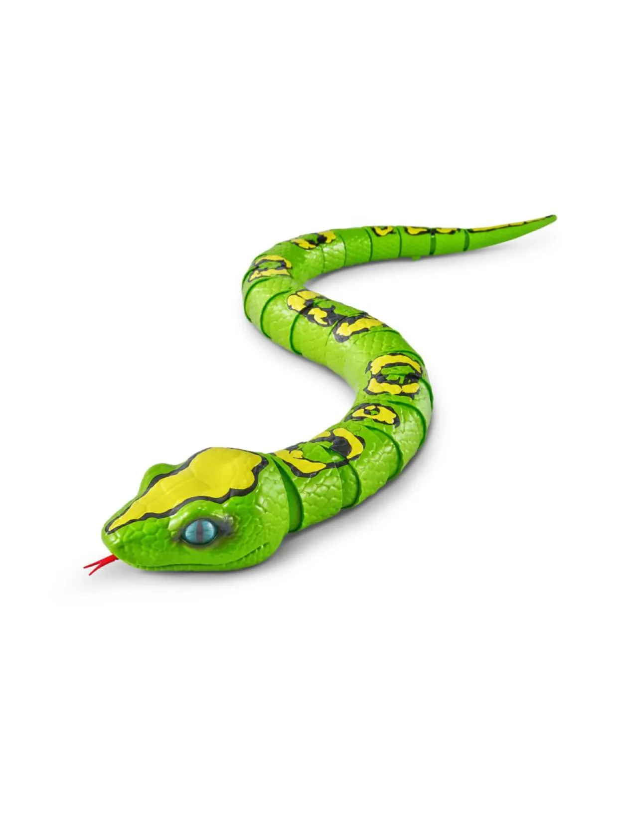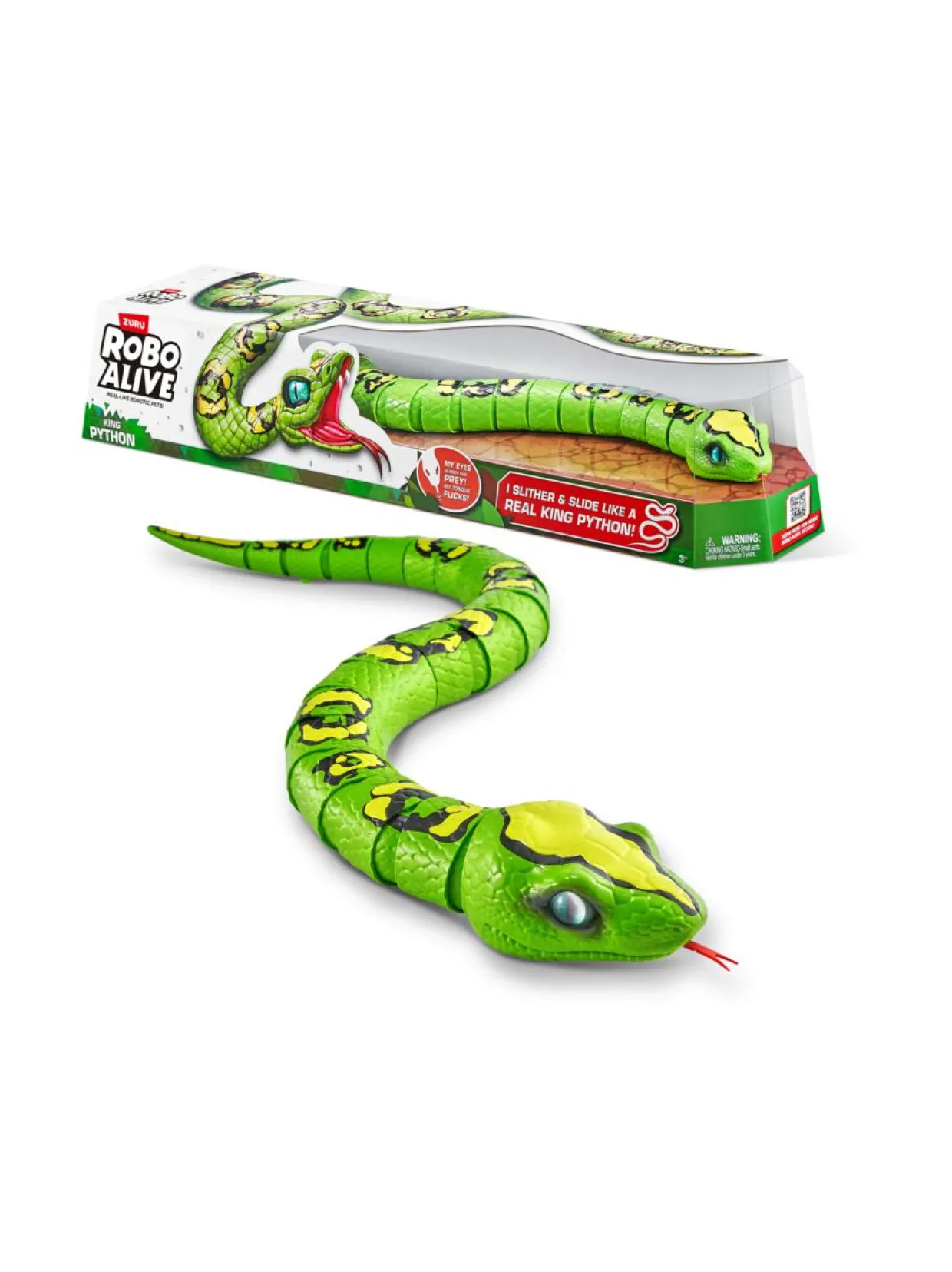 Varo! Tämä on Robo Aliven kuningaspyton! Realistinen matelija hyödyntää innovatiivista robotiikkateknologiaa ja liikkuu matelemalla aivan kuin oikea käärme. Piilota kuningaspyton ruokapöydän alle ja säikäytä koko perheesi tai sujauta se salaa sisaruksesi reppuun karmivaksi yllätykseksi kesken koulupäivän. Voit myös säikäyttää kaverisi piilottamalla kuningaspytonin tyynyn alle, mikä aiheuttaa taatusti kauhunhuutoja nukkumaanmenoaikaan! Kuningaspyton on uskomattoman aidon näköinen peto, joka on 80 cm pitkä mitattuna kielen kärjestä hännän päähän! Yllätykset muuttuvat Robo Alivein kuningaspytonin avulla karmivan hauskoiksi!