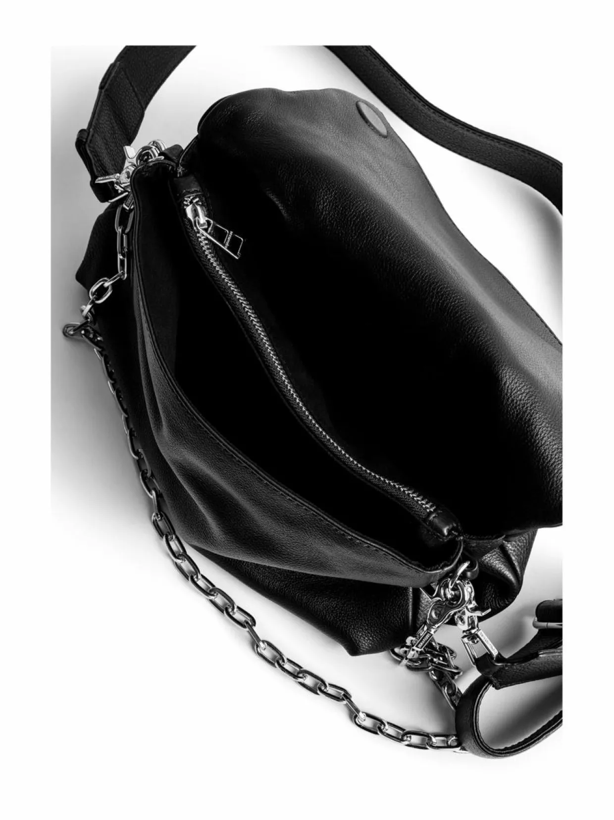 Näyttävä Zadig&Voltaire Rocky -laukku on valmistettu pintakuvioidusta nahasta. Laukku taittuu kahtia ja kiinnittyy magneettinapeilla. Laukku suljetaan kaksisuuntaisella vetoketjulla ja sisäpuoli on jaettu kahteen osaan vetoketjutaskulla. Taustapuolella on vetoketjutasku. Laukussa on kaksi irrotettavaa olkahihnaa.