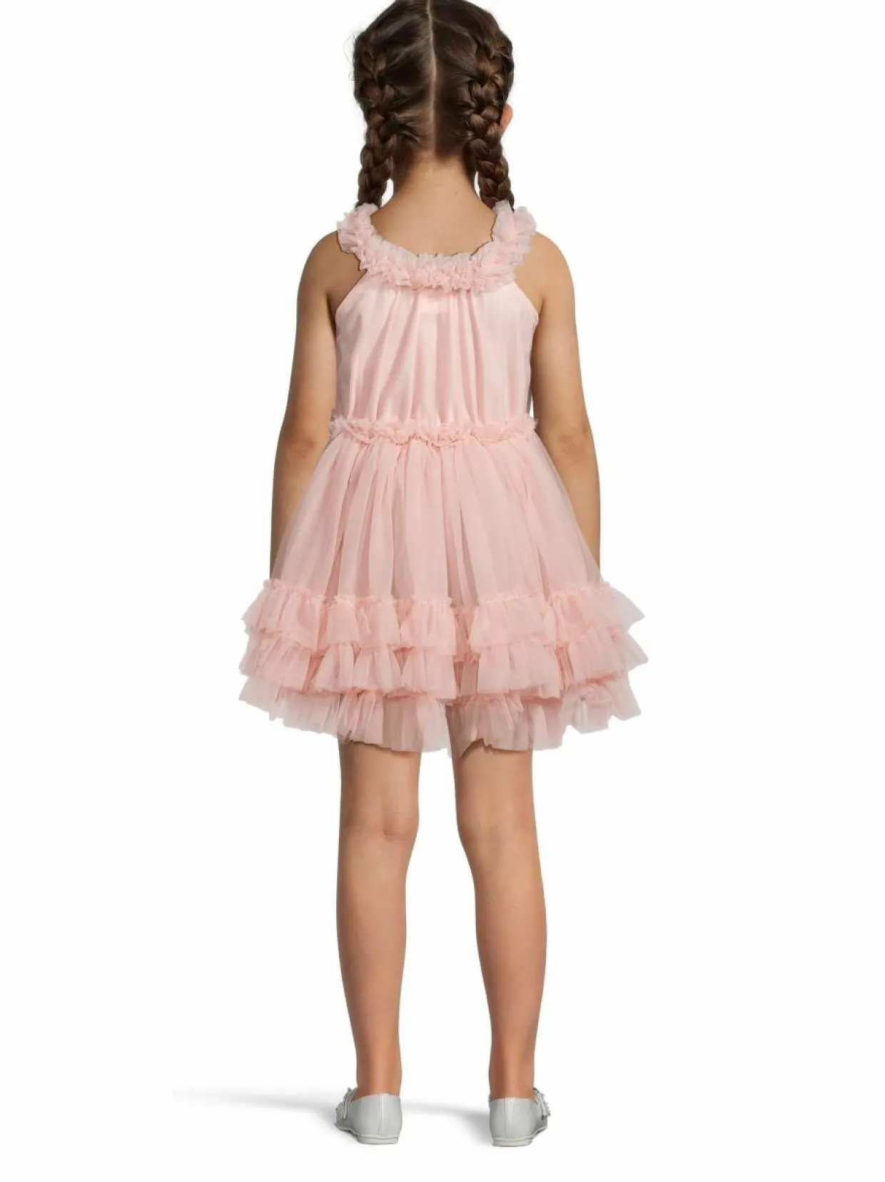 Pehmeä volyymihelmainen mekko pikkuprinsessoille. Röyhelöolkaimet yhdistyvät kauniisti röyhelökoristeiseen yläosaan, jatkuen helmaan asti. Dolly by Le Petit Tom on brändi, jonka mekot ovat unenomaisia ja saavat inspiraationsa baletin tutuhameista.
