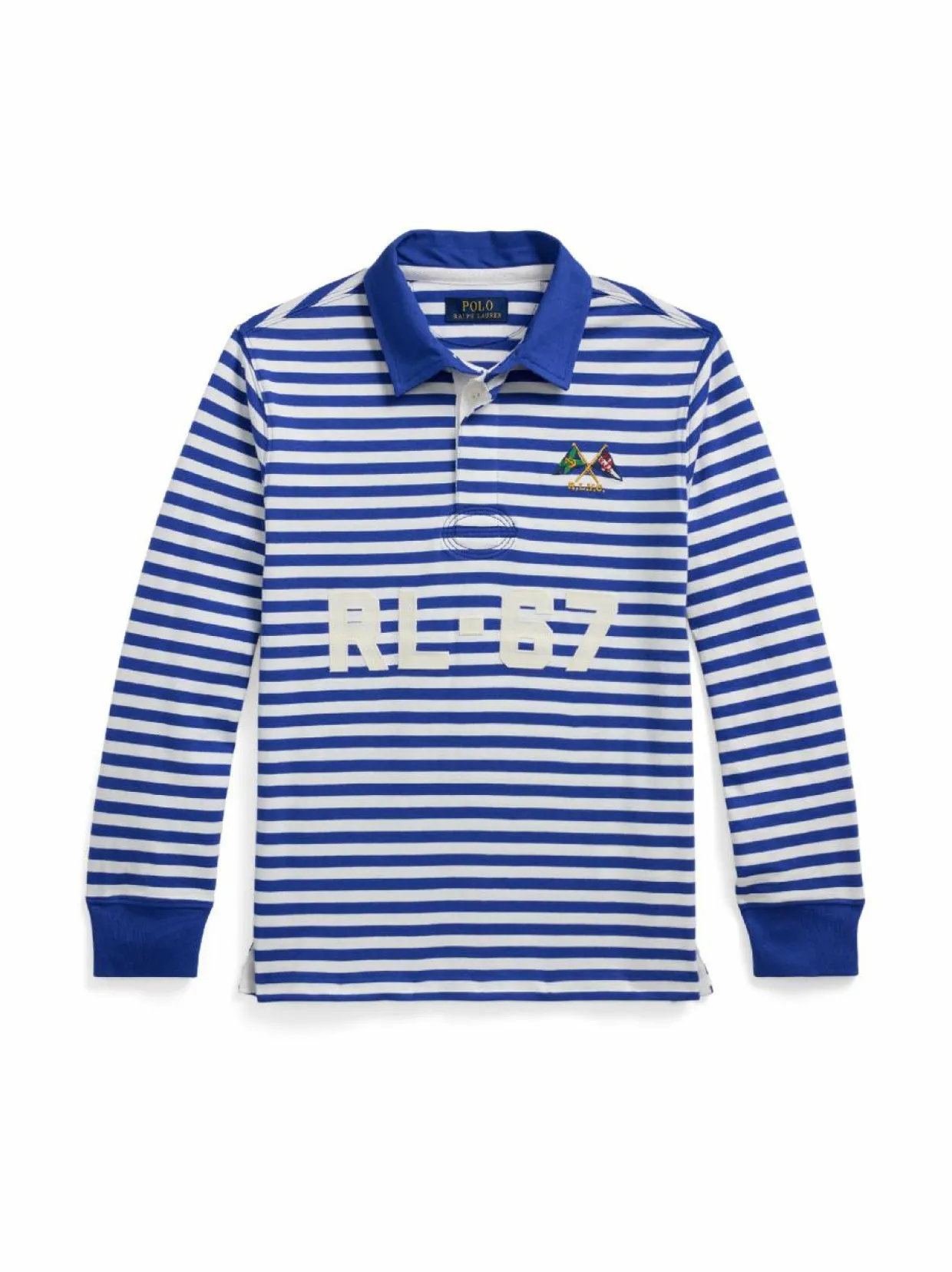 Klassinen, raidoilla koristeltu rugbypaita Polo Ralph Laurenilta. Paita on valmistettu pehmeästä, puuvillaisesta kankaasta. Yksityiskohtana resorit hihansuissa ja napitettu kaulus. Etupuolella näkyy iso ”RL 67” -logo ja brodeerattu logo rinnassa. Vaate on suunniteltu normaaliin istuvuuteen.