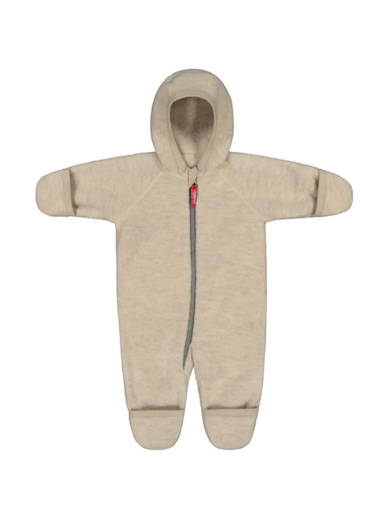 Haalarissa on pitkä vetoketju, joka helpottaa pukemista. Hihan- ja lahkeensuut ovat käännettävissä. Villafleece ei sisällä ollenkaan keinokuituja, eikä siitä irtoa pesussa luonnolle haitallisia mikromuoveja.