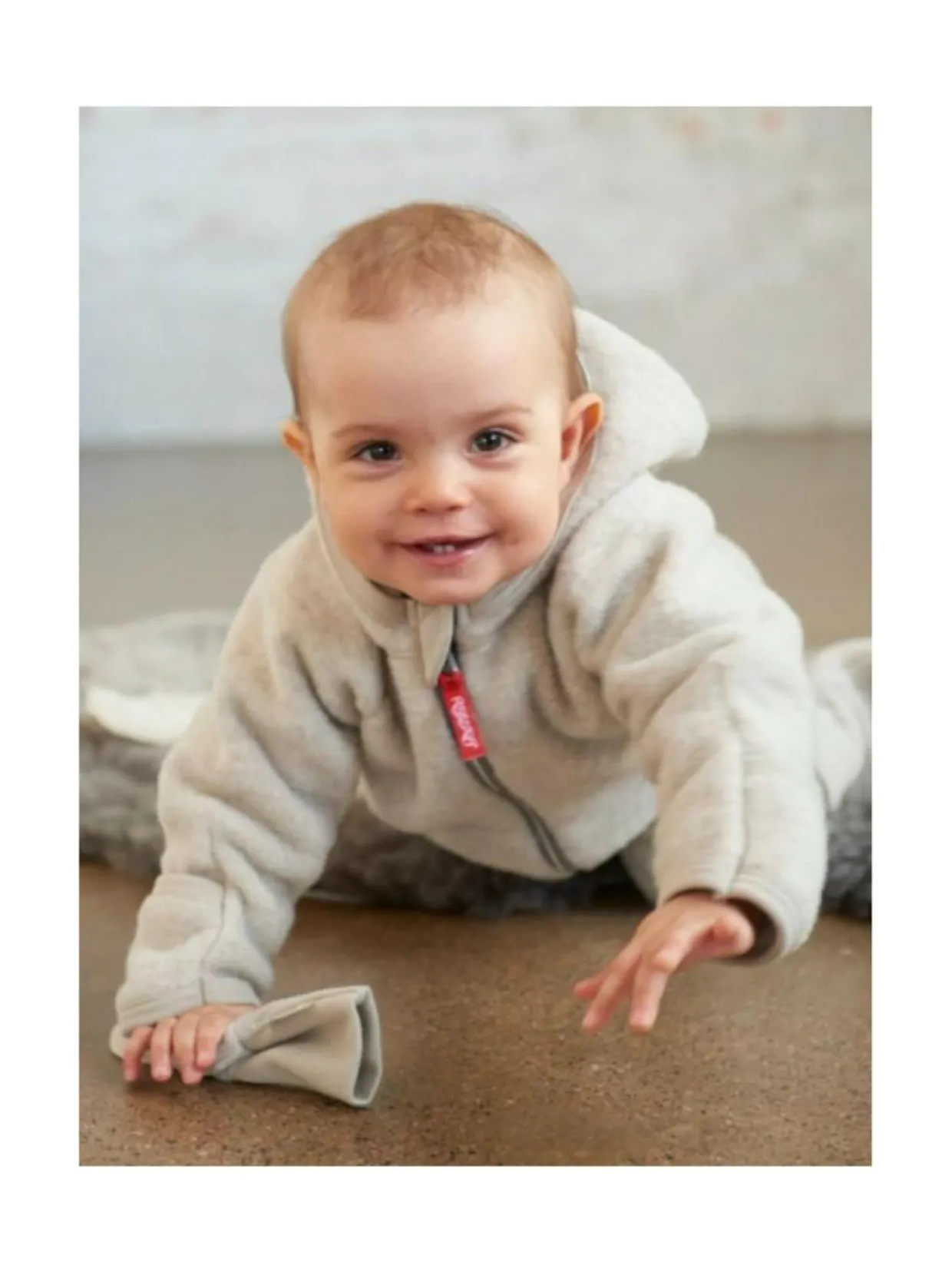 Ruskovilla hupullinen haalari on valmistettu GOTS-sertifioidusta 100% luomumerinovillafleecesta. Se on materiaalina lämmin ja hengittävä ja haalari sopii käytettäväksi esimerkiksi vaunuissa ja turvaistuimessa. Kevyesti harjattu pinta on untuvan pehmeää ja tuntuu miellyttävältä paljasta ihoa vasten.