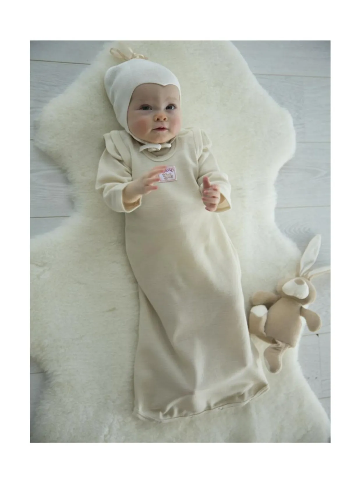 Ruskovilla unipussi on 100% luomumerinovillaa. Unipussin pohja suljetaan neppareilla ja pussi sopii hyvin vauvalle pitkään olkainten säätövaran ansiosta. Unipussin pituus on suurimmalla nepitysvaralla noin 73 cm (olkapää – pussin pohja) ja unipussi sopii noin vuoden ikään.