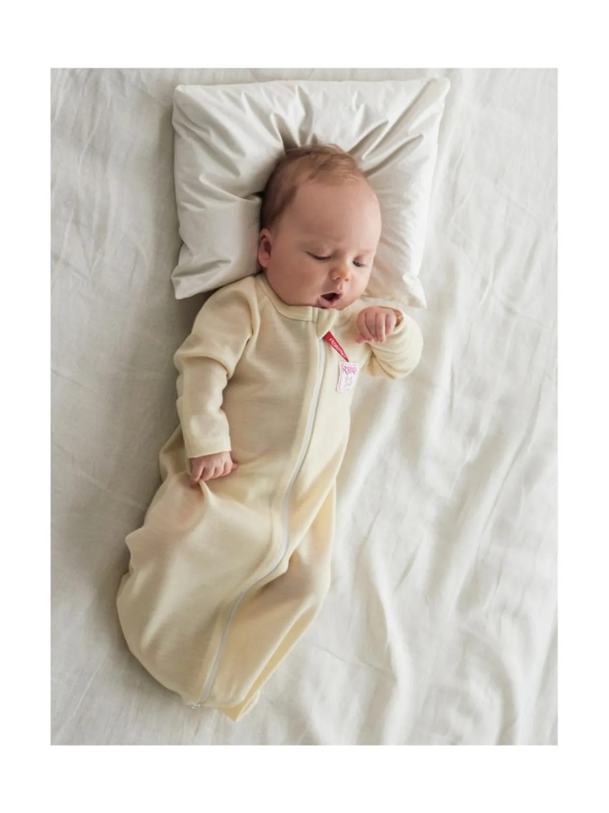 Ruskovilla unipussi hihoilla on 100 % luomumerinovillaa. Hihallisessa unipussissa on pitkä kaksisuuntainen vetoketju sekä hihat, joissa on sormien-yli-käänteet (huom, ei koossa 90cm). Vetoketjun päässä leuan alla on kangas, jotta vetoketju ei hankaa ikävästi leukaan.