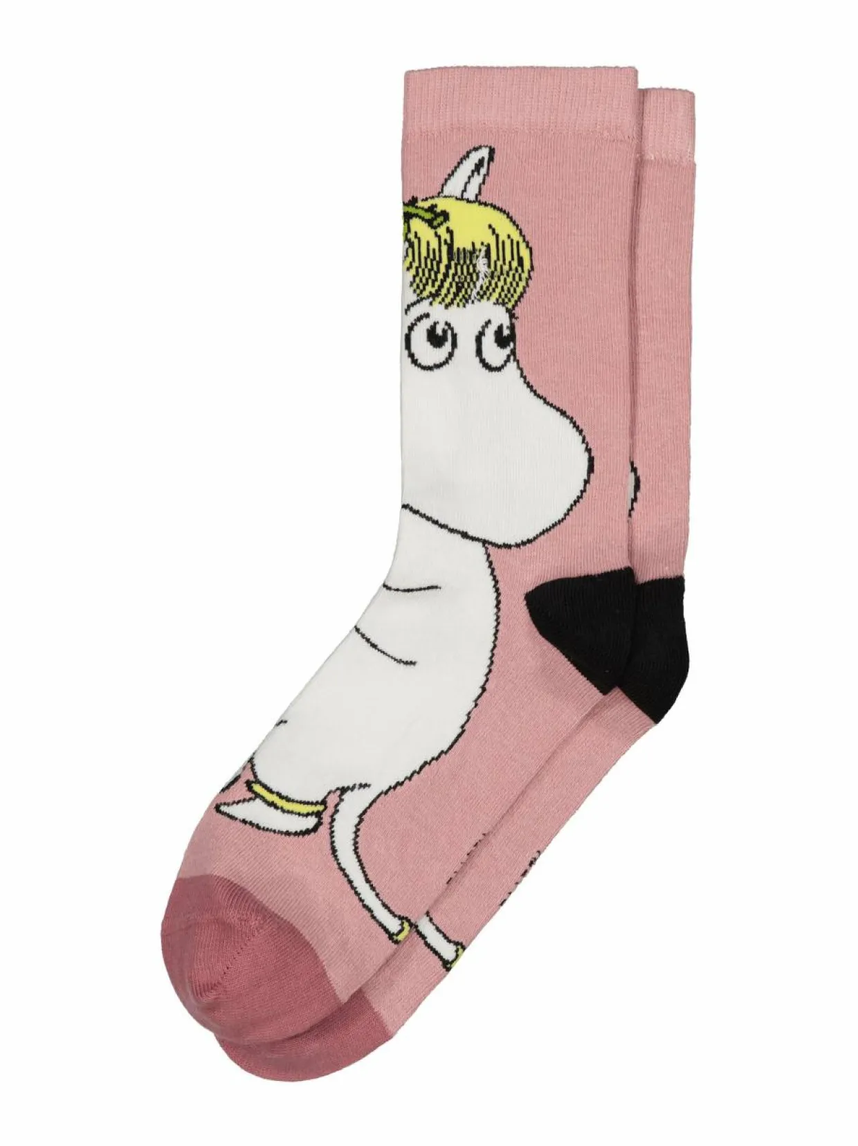 Muumien mukavat sukat aikuisille, joita koristaa koko etuosan kokoinen kuva Niiskuneidistä ja ruususta. Yläreunoissa on resorit. Materiaalina joustava puuvillasekoite.