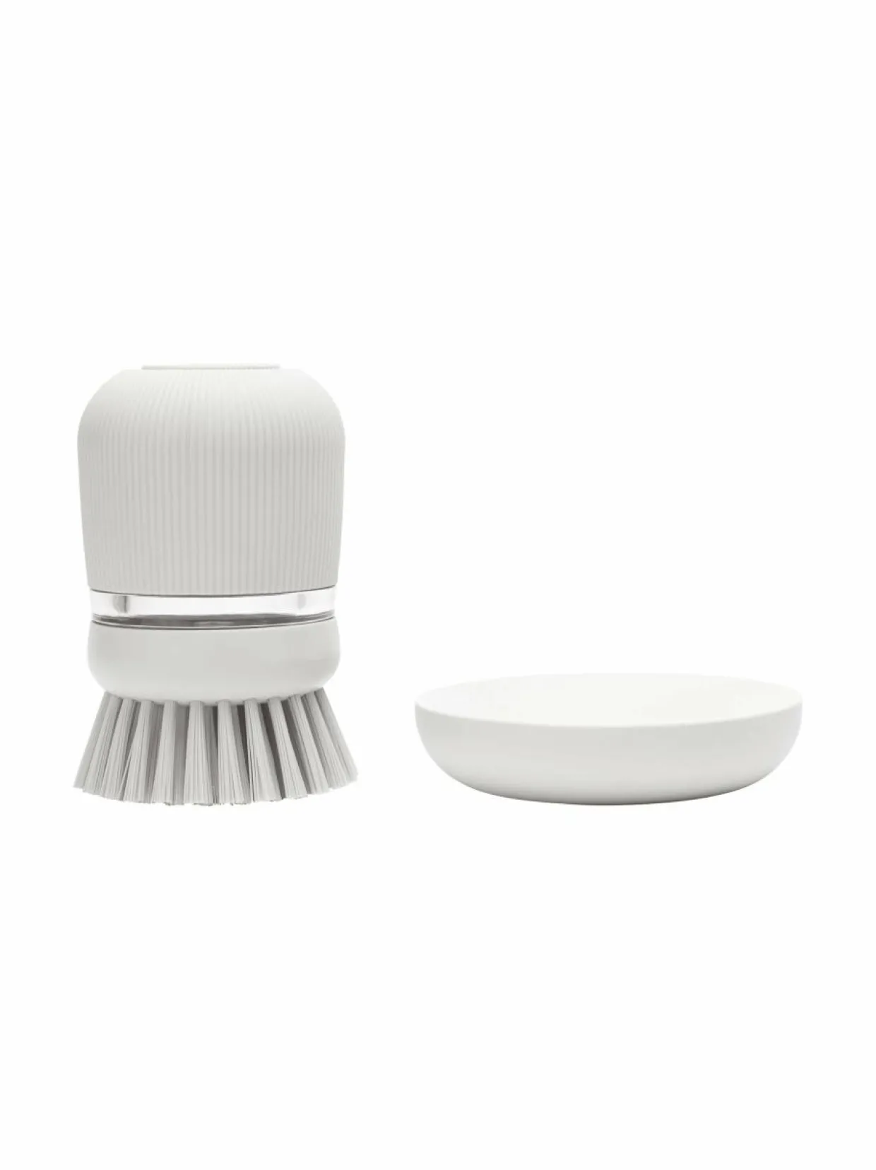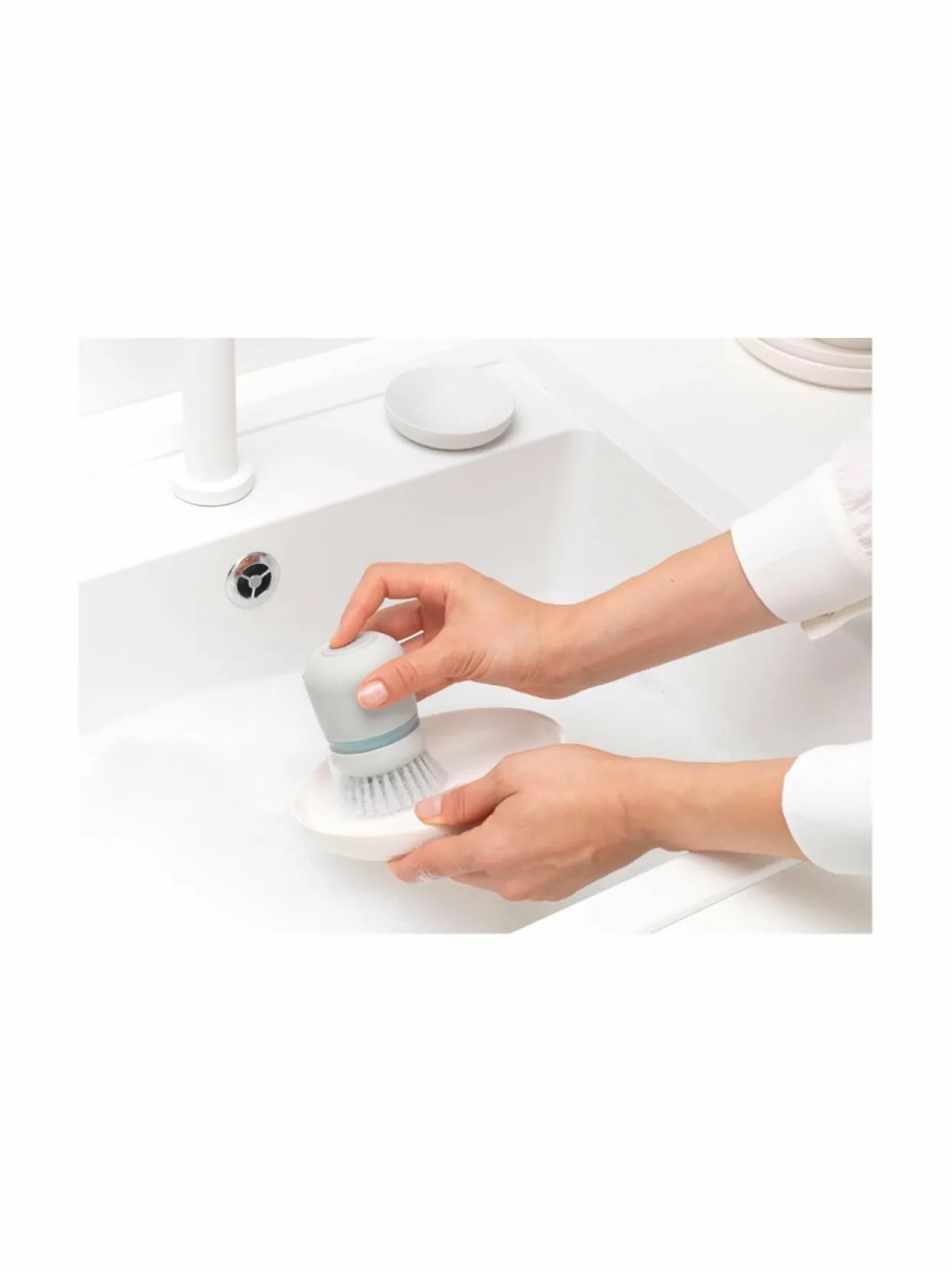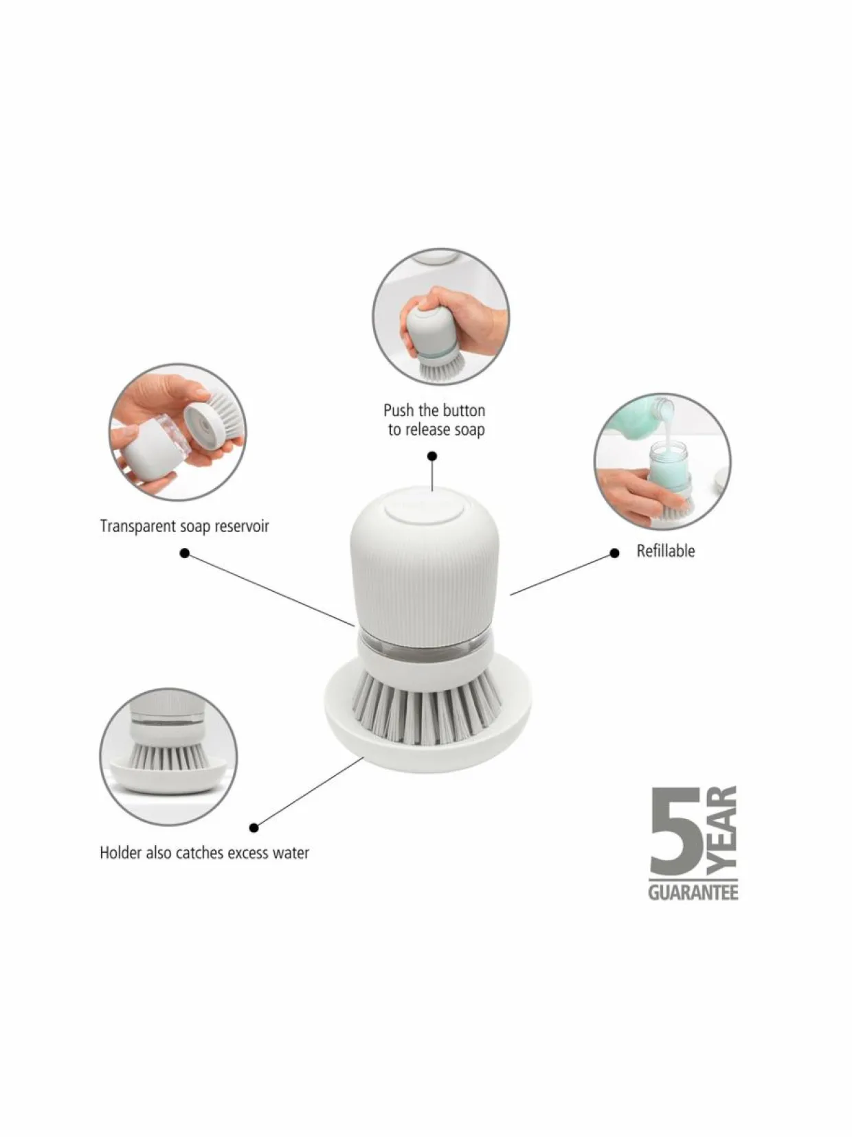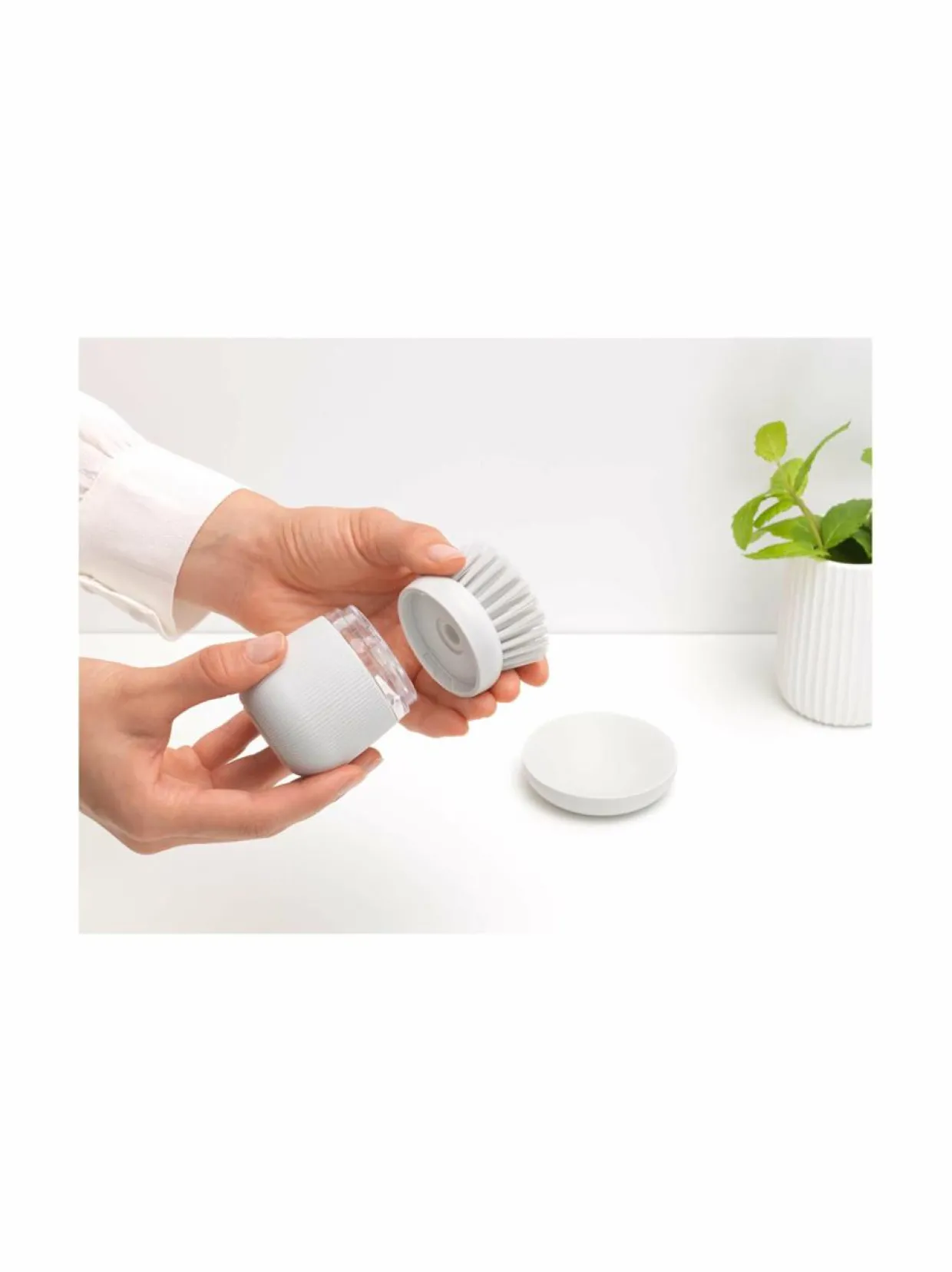 Brabantian saippuaa annosteleva tiskiharja on käytännöllinen ja helppo käyttää. Tiskiharja annostelee juuri sopivan määrän saippuaa tiskatessa, päällä on annostelunappi. Harjan pääty on ergonomisesti muotoiltu ja säiliö on helppo täyttää isosta täyttöaukosta. Tiskiharjan vaihtopäät myydään erikseen, mukana pakkauksessa yksi harja ja alusta. Mitat 8,6 x 8,6 x 10,5 cm.