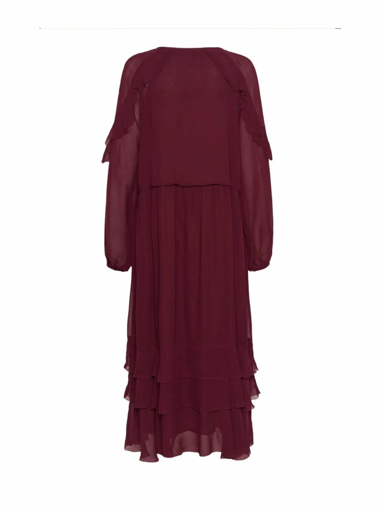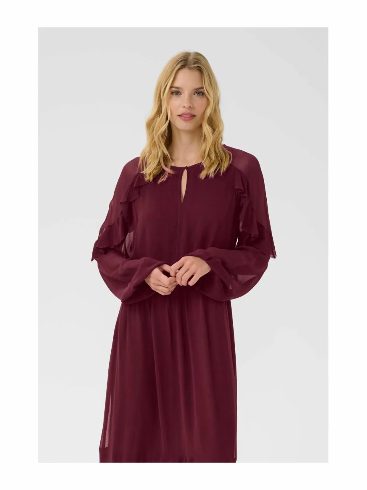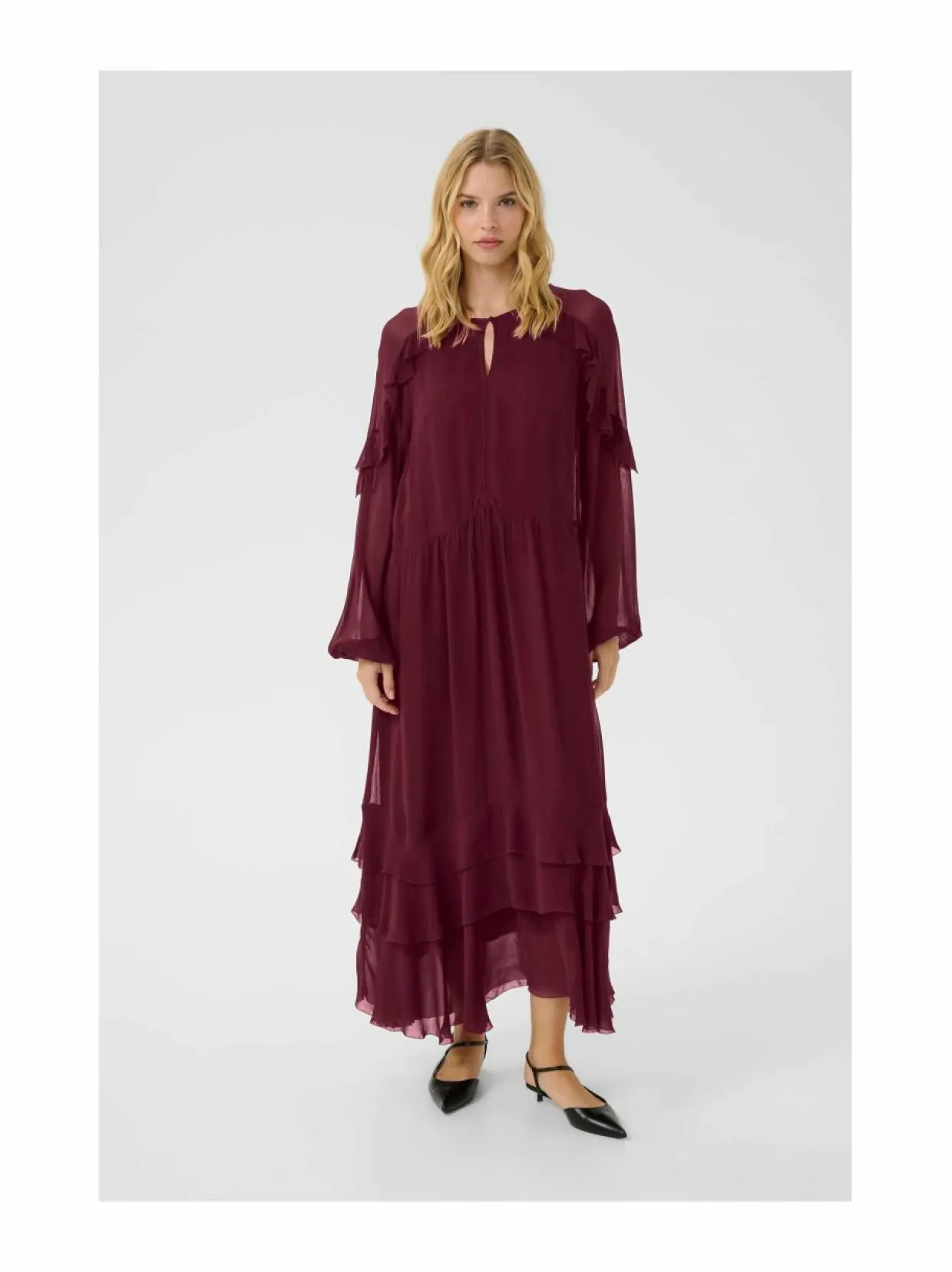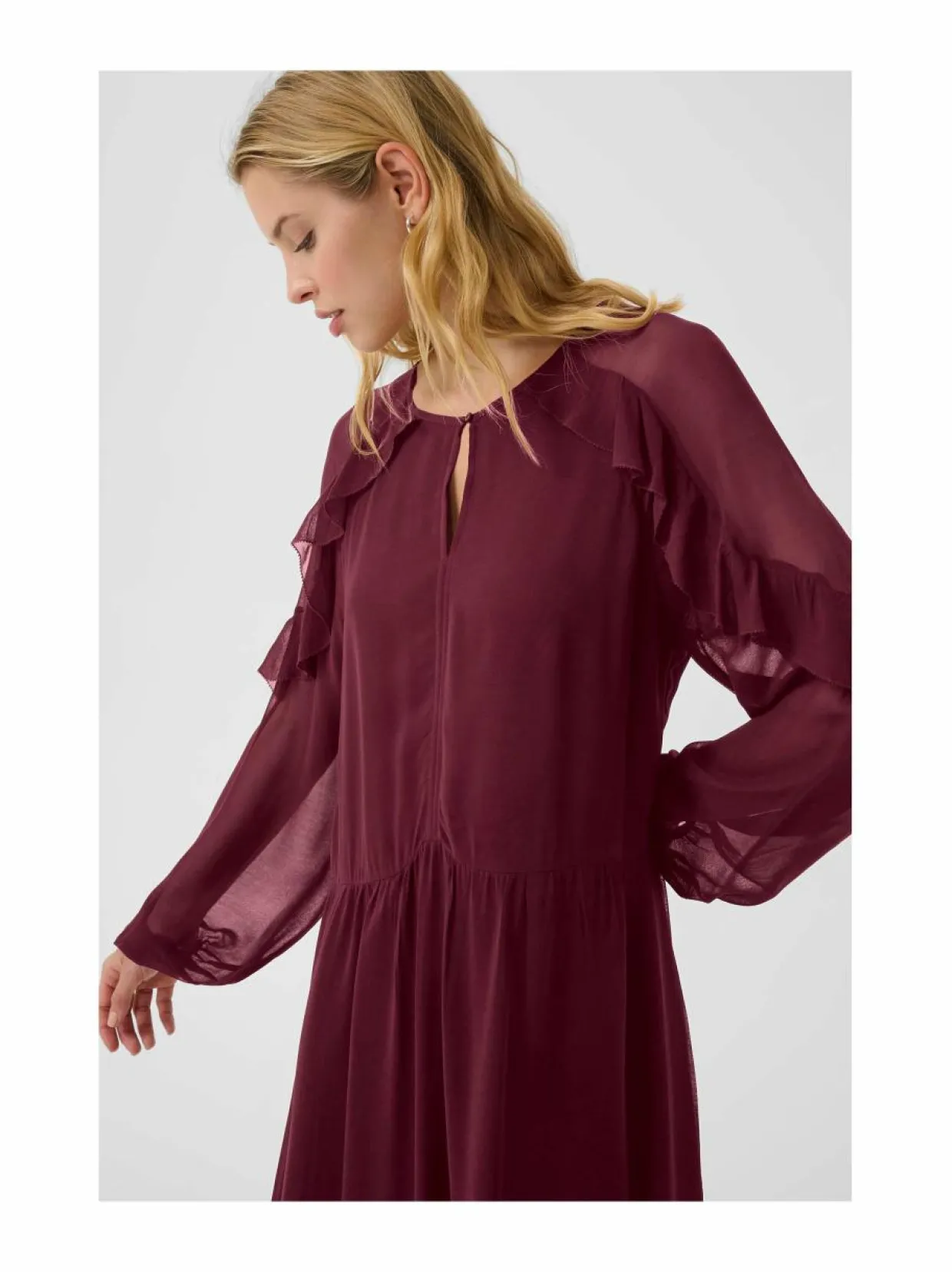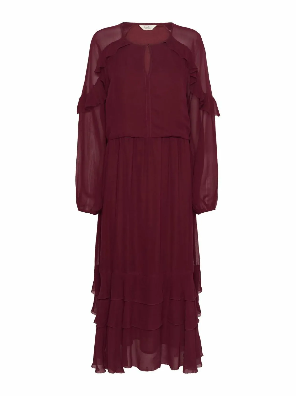 Materiaali100 % viskoosi Hoito-ohjeetNoudata valmistajan hoito- ja pesuohjeita Väri191725 TAWNY PORT Avainsanatmekko, kesämekko, viskoosimekko, PART TWO, juhlamekko, frillamekko