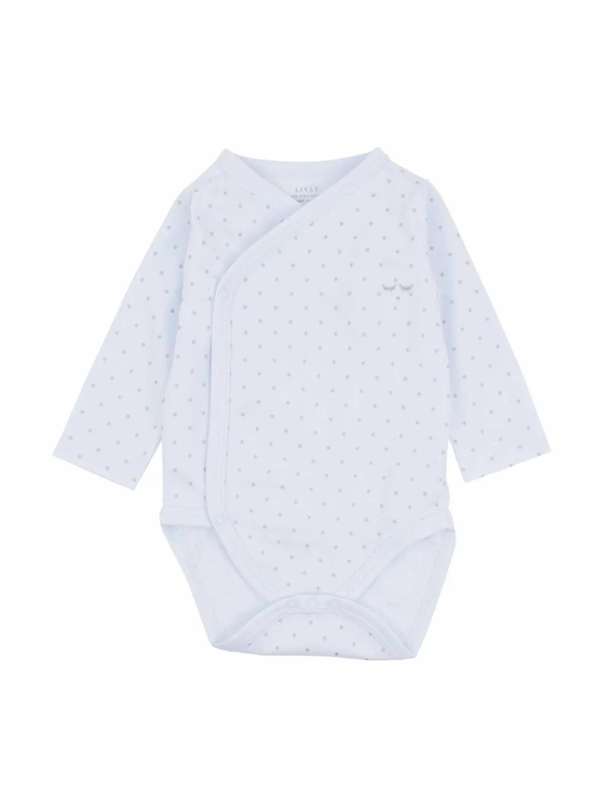 Suloinen body pilkullisella kuviolla ja asymmetrisellä nepparilistalla, joka on nikkelittön. Mallissa on käytännölliset nepparit myös haaraosassa.