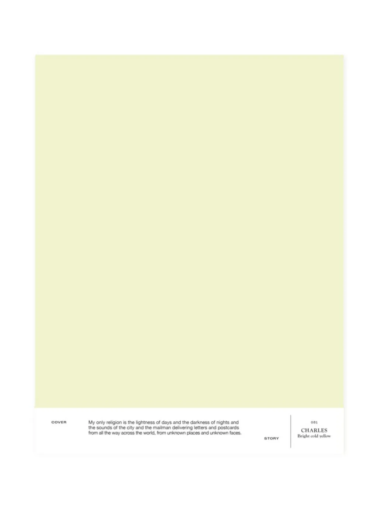 031 CHARLES on kirkas kylmän keltainen, joka on valoisa ja rohkea vaalean sävy. Yhdistyy tilassa upeasti kaikkiin kirkkaisiin perussävyihin ja palauttaa 50-luvun tunnelmaan. A4-kokoinen tarrataustainen värimalli on maalattu aidolla täyshimmeällä Cover Story -maalilla, joten voit olla varma, että sävy on sama kuin varsinaisessa maalissa. Mallitarran voi liimata helposti suoraan maalattavalle pinnalle ja katsoa, miltä sävy näyttää erilaisissa valaistuksissa – valon laatu ja määrä vaikuttavat merkittävästi siihen, miten havaitsemme värin.