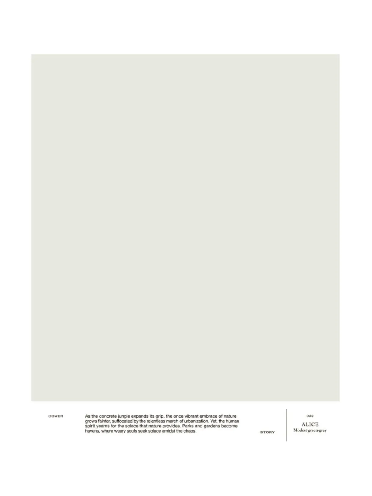 039 ALICE on hento harmaanvihreä maalisävy. Tämä murrettu vaaleanvihreä on klassisen hienostunut seinäsävy, joka elää eri valo-olosuhteissa ja vuodenaikoina tasaisen kauniisti ja luo pehmeää tunnelmaa tilaan. A4-kokoinen ja tarrataustainen värimalli on maalattu aidolla täyshimmeällä Cover Story -maalilla, joten voit olla varma, että sävy on sama kuin varsinaisessa maalissa. Mallitarran voi liimata helposti suoraan maalattavalle pinnalle ja katsoa, miltä sävy näyttää erilaisissa valaistuksissa, sillä valon laatu ja määrä vaikuttavat merkittävästi siihen, miten havaitsemme värin.