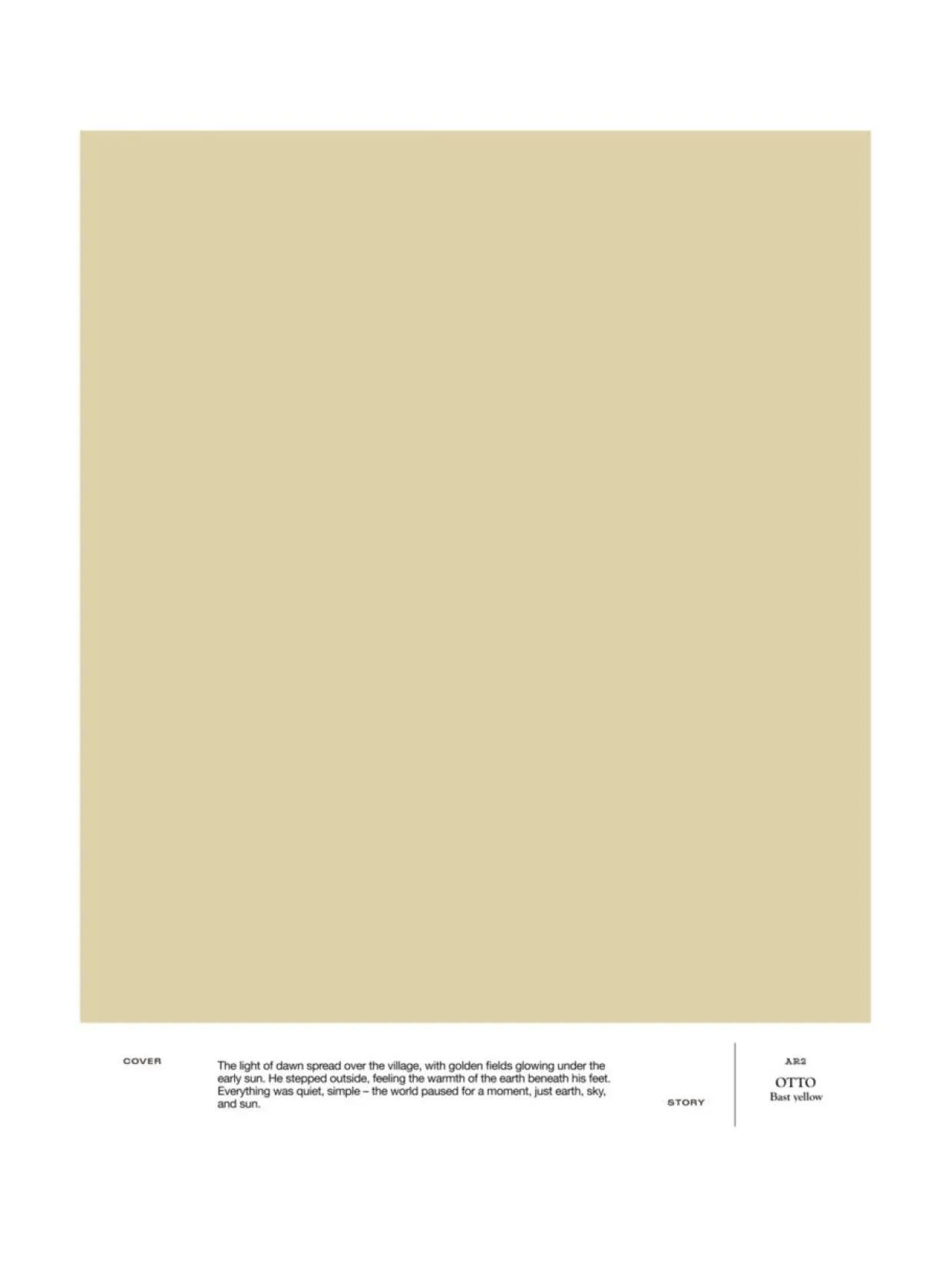 AR2 OTTO – Bast yellow on luonnollinen niinenkeltainen sävy tuo tilaan pehmeyttä ja lämpöä. Sen kodikas luonne luo ajattoman taustan niin moderneille kuin perinteisille sisustuksille. Sävy on osa Cover Story x Artek Helsinki -sisämaalikokoelmaa. A4-kokoinen tarrataustainen värimalli on maalattu aidolla täyshimmeällä Cover Story -maalilla, joten voit olla varma, että sävy on sama kuin varsinaisessa maalissa. Mallitarran voi liimata helposti suoraan maalattavalle pinnalle ja katsoa, miltä sävy näyttää erilaisissa valaistuksissa – valon laatu ja määrä vaikuttavat merkittävästi siihen, miten havaitsemme värin.