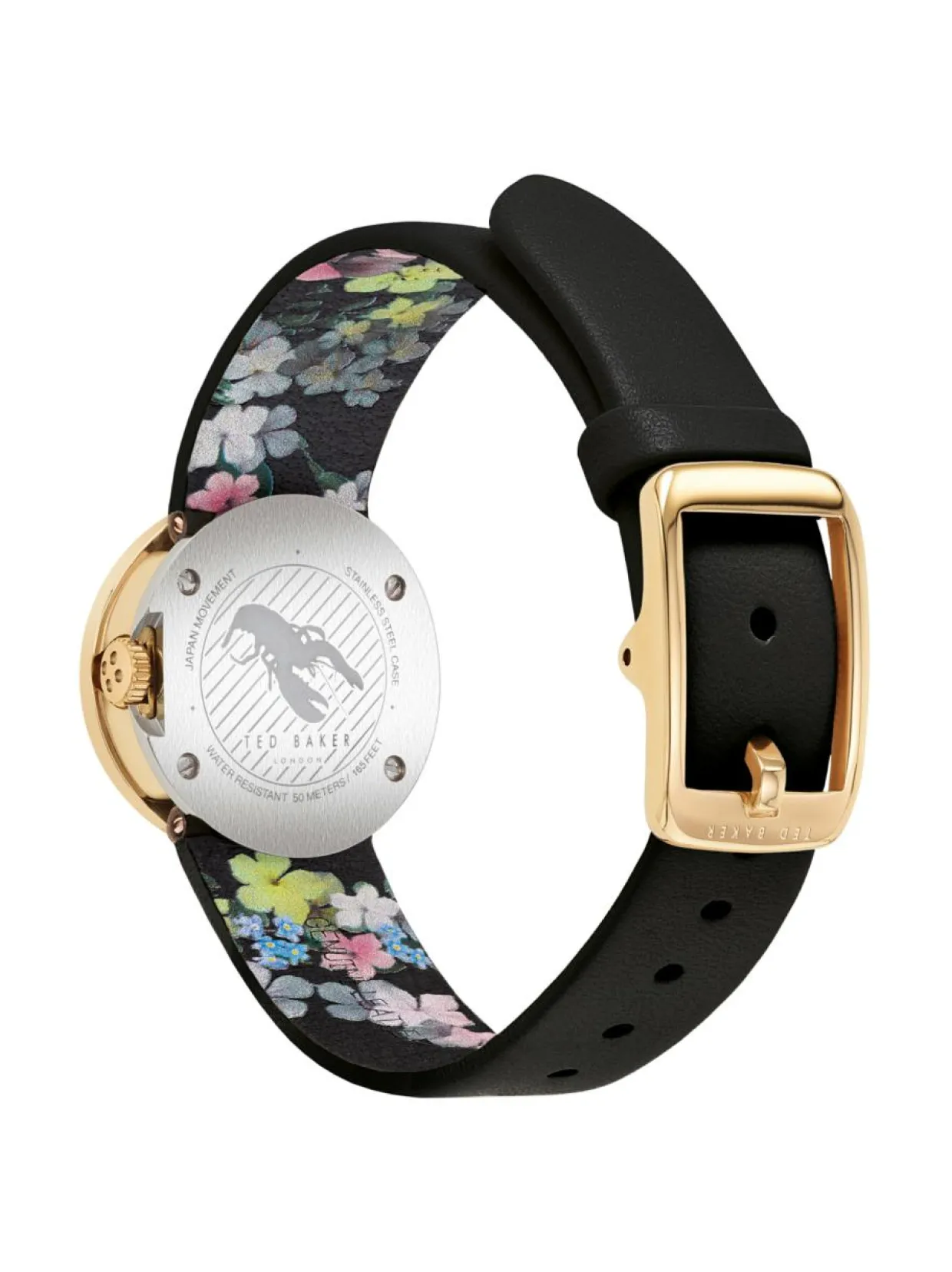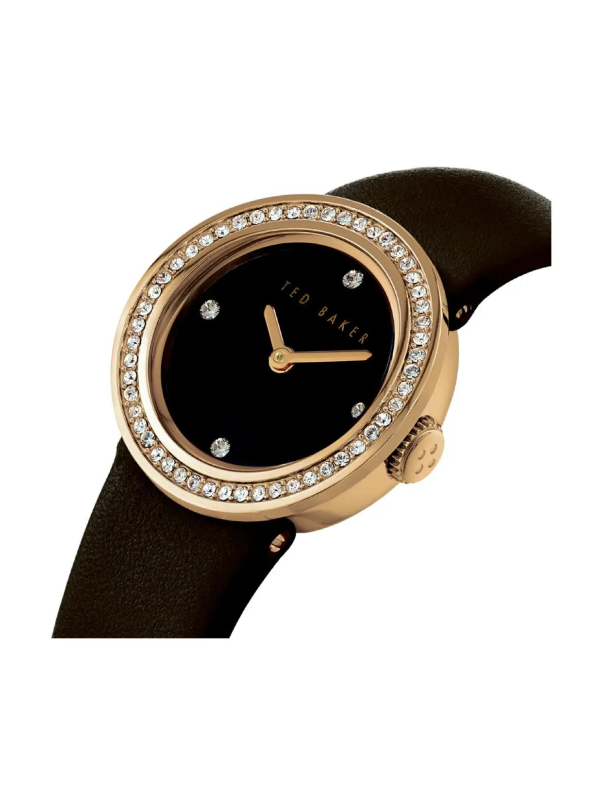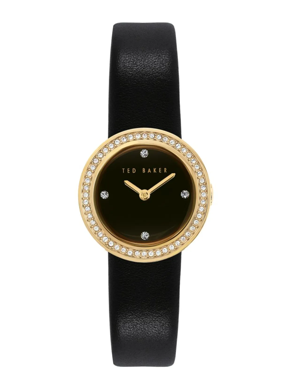 Ted Baker Seerena 24mm rannekello on kuin koru. Kun haluat juhlan tuntua jokaiseen hetkeen. Kellon kullanvärinen runko on valmistettu ruostumattomasta teräksestä. Sen leveys on 24mm ja paksuus on 6mm. Kellon kehällä on Swarovskin kristalleja. Tässä kellossa on musta nahkaranneke. Kellon mustassa taulussa on Swarovskin kristalleja neljännestunnin kohdalla. Kellossa on mineraalilasi ja kvartsikoneisto. Kellon vesitiiviys on 5ATM. Ted Baker kelloilla on 2 vuoden takuu.