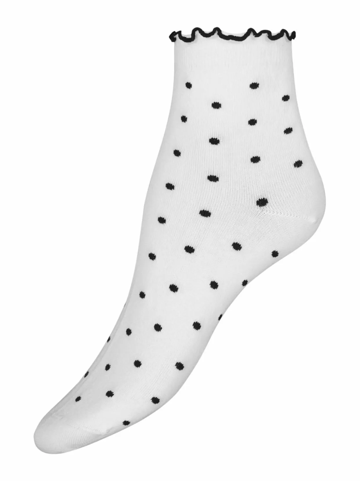 Kiristämättömät röyhelöreunuksiset nilkkasukat Vogue merkiltä. Pakkauksesta löydät kaksi sukkaparia, joista toinen on yksivärinen ja toisessa on elegantti pilkkukuosi. Serena-sukkien materiaalina on käytetty pehmeän tuntuista luomupuuvillasekoitetta.