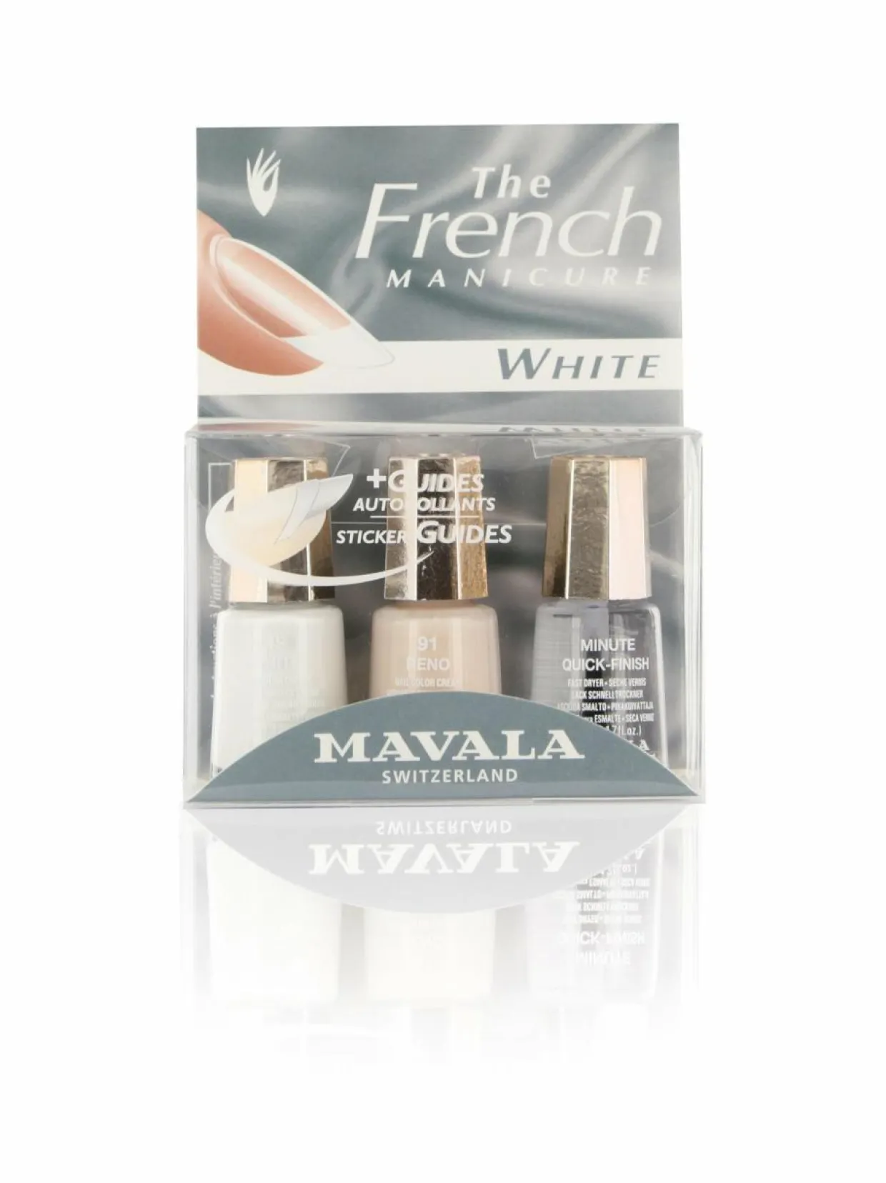 Mavala Set French Manicure White -tuotepakkaus sisältää kolme lakkaa, joilla loihdit kauniin ranskalaisen manikyyrin.