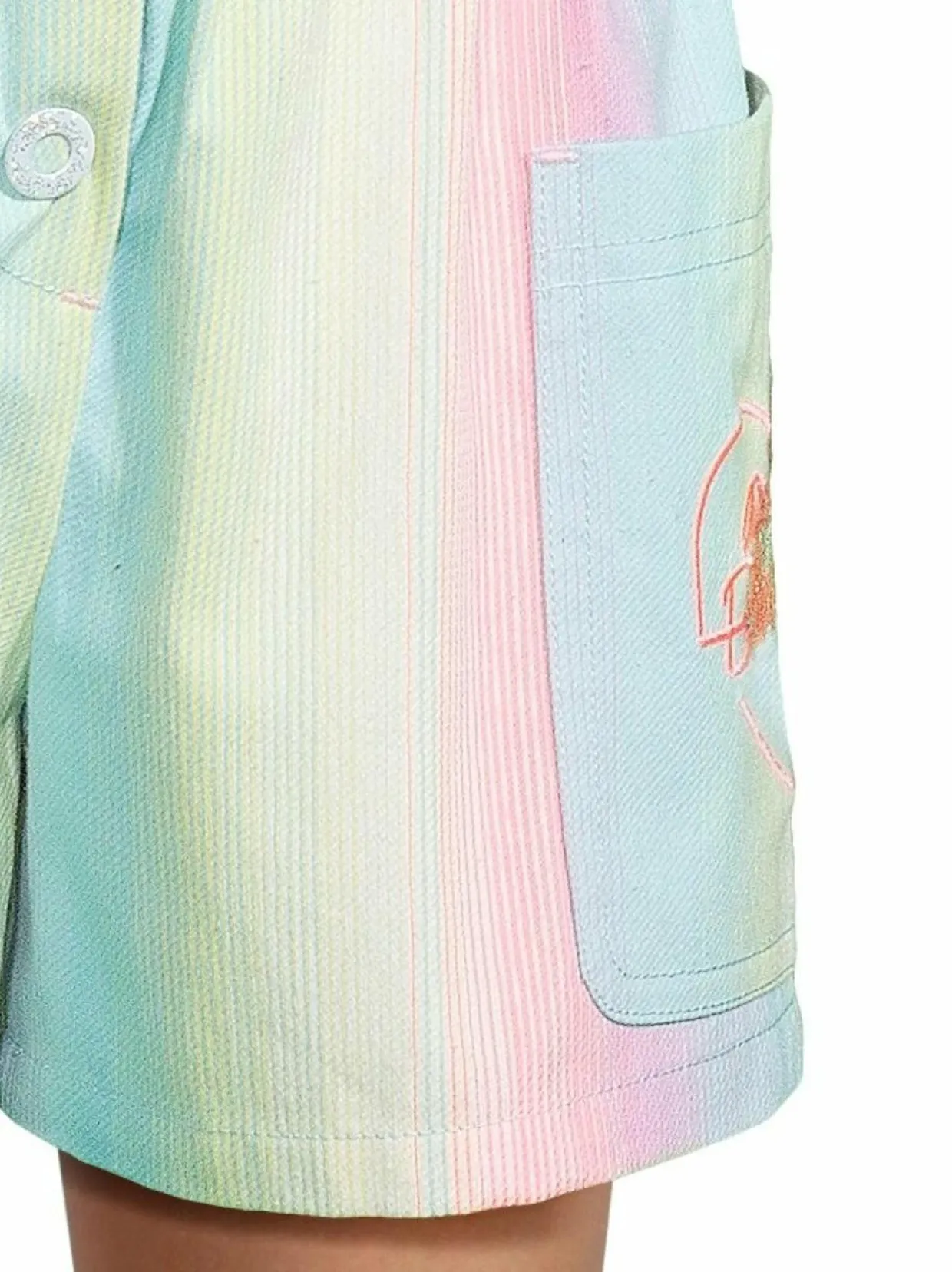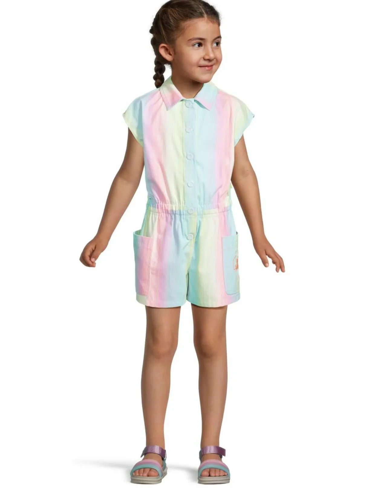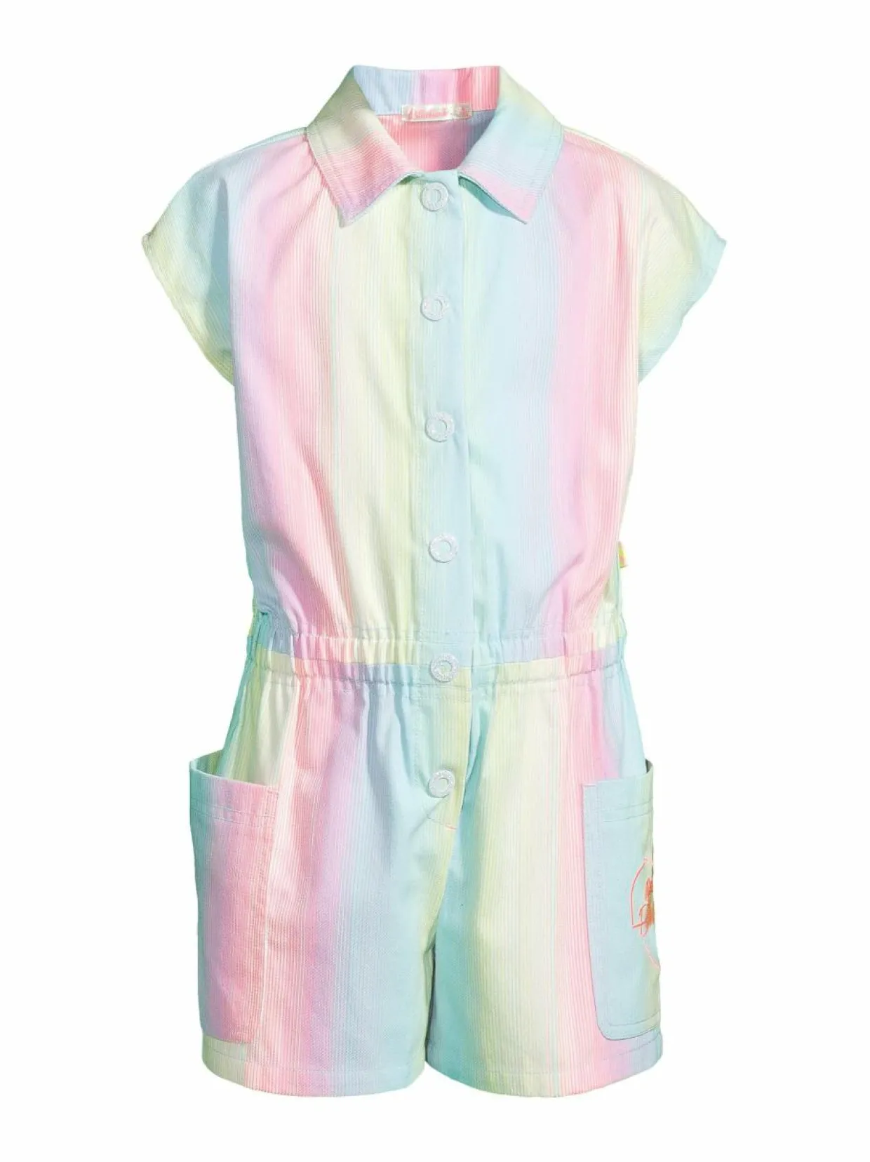 Billieblushin shortsihaalari on valmistettu pehmeästä puuvillasekoitteesta ja siinä on värikäs, raidallinen kuosi. Haalarissa on lyhyet hihat, paitakaulus ja napit edessä. Vyötäröllä on kuminauha ja lahkeissa taskut. Yhtä taskua koristaa kuvitus.