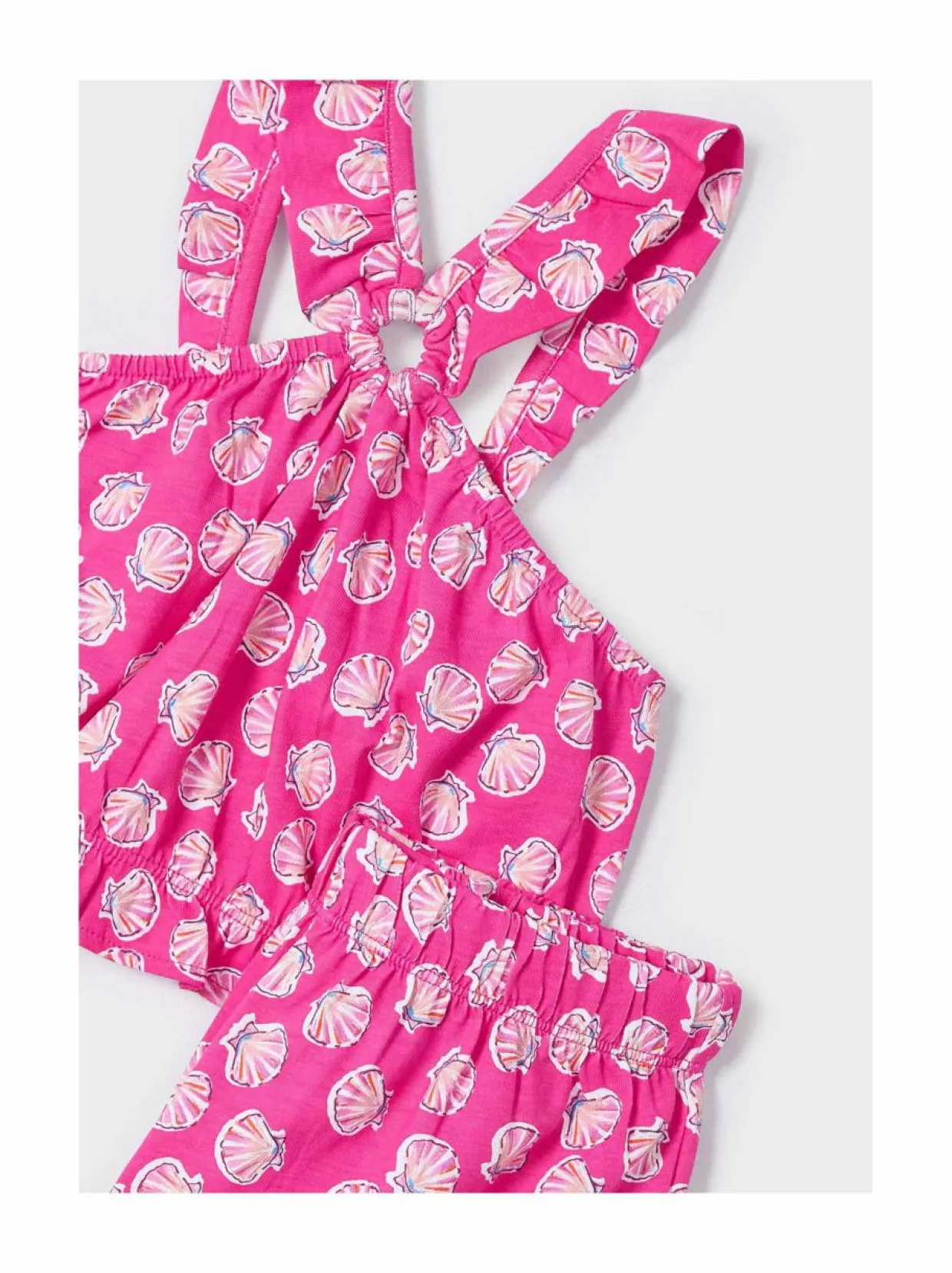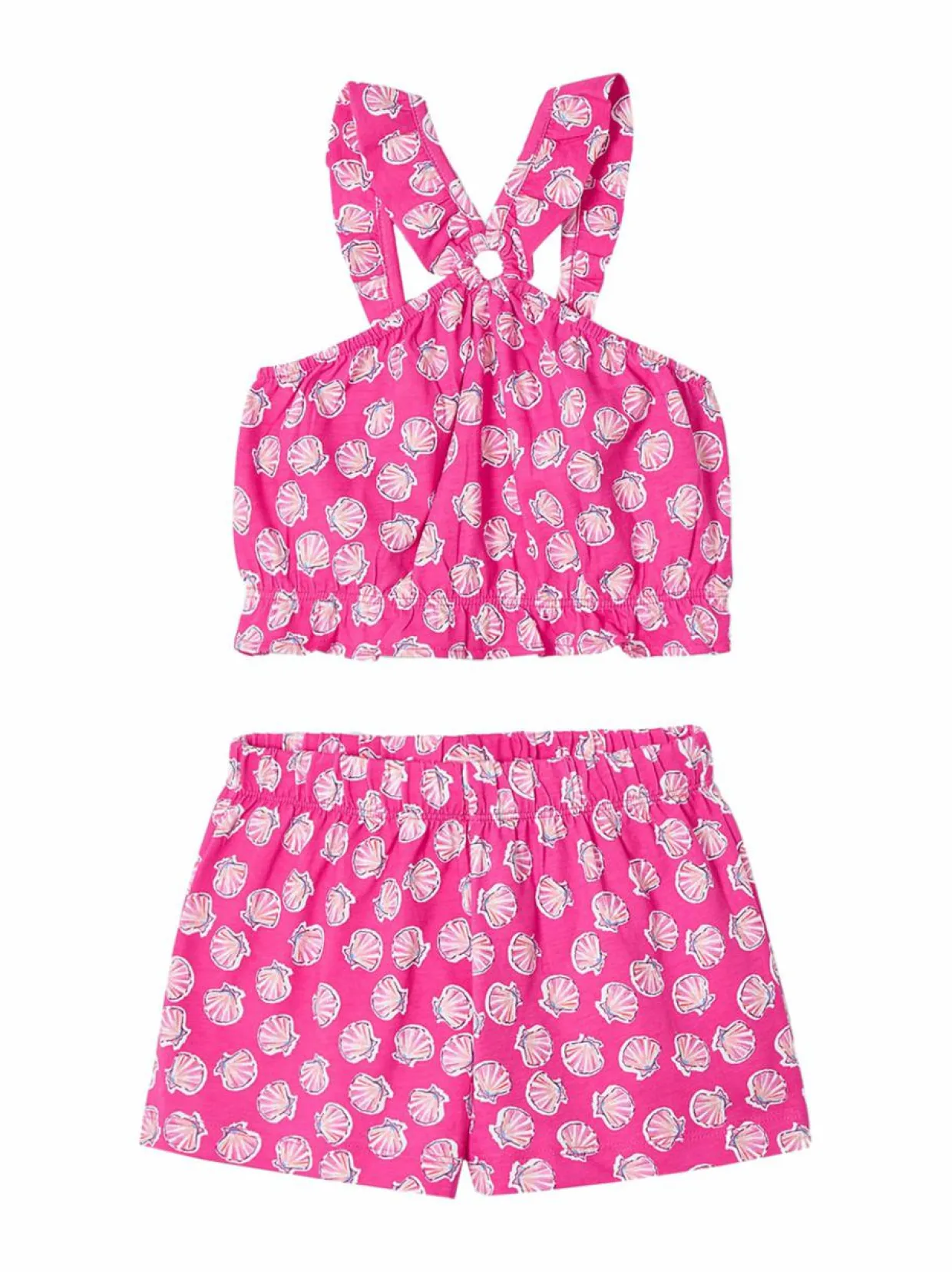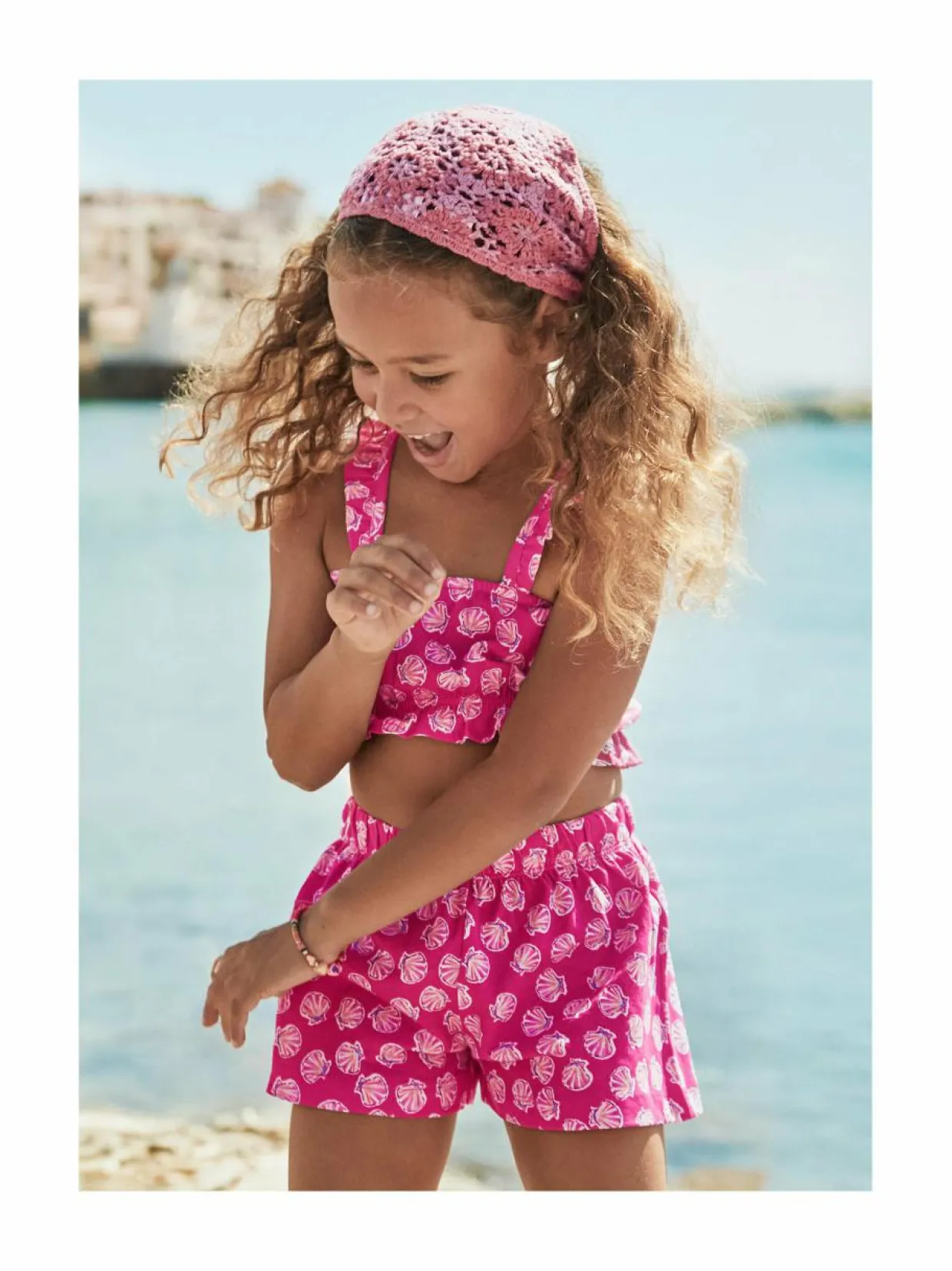 Mayoralin ihastuttava setti, johon kuuluvat shortsit ja toppi. Topissa on lyhyehkö röyhelöhelma sekä kauniit olkaimet. Toppia somistaa lisäksi rengasyksityiskohta edessä. Shortseissa on joustava vyötärö. Setti on valmistettu 100 % puuvillasta ja se on ihanteellinen valinta kuumaan kesäpäivään.