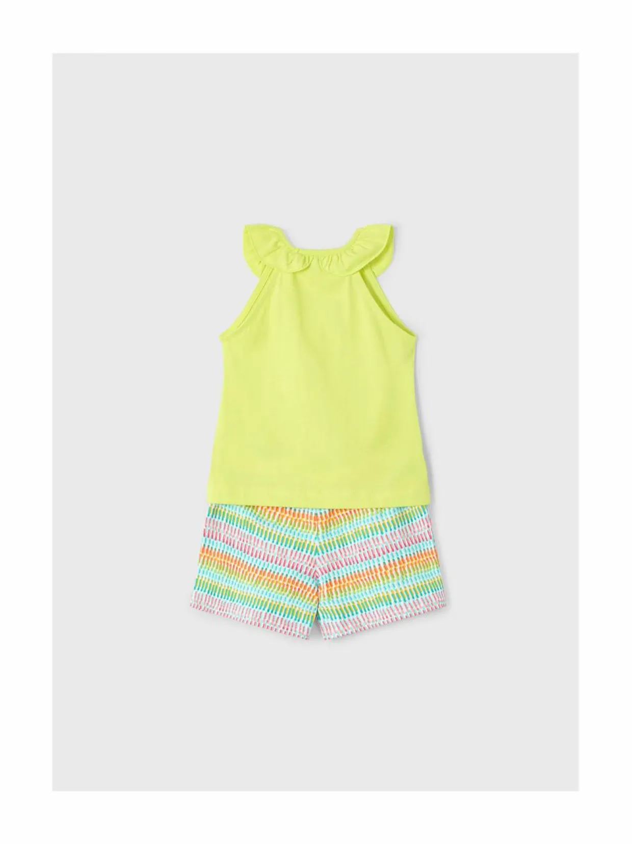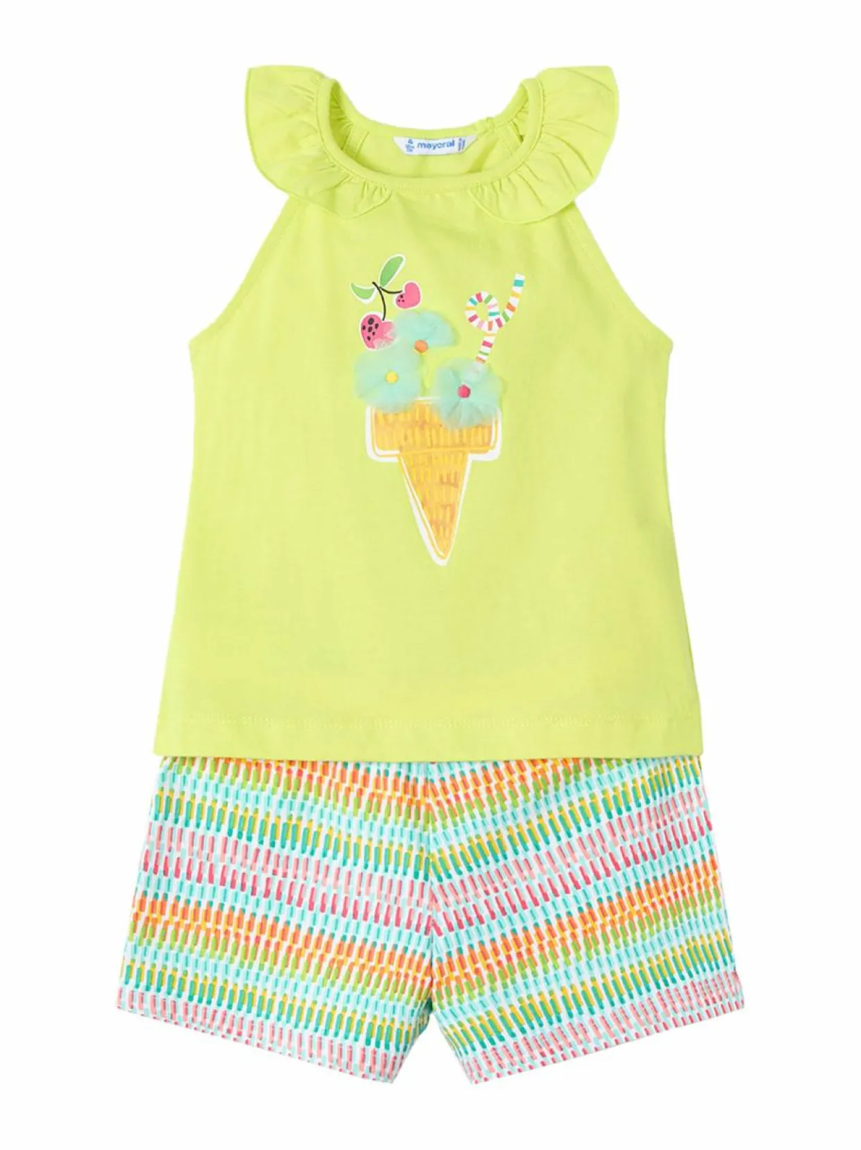 Mayoralin setti, johon kuuluvat shortsit ja toppi. Ne on valmistettu 100 % puuvillatrikoosta. Topissa on röyhelölliset olkaimet ja söpö jäätelökuvio, jota täydentävät 3D mesh -koristeet. Shortsit ovat printtikuvioidut. Setti on ihanteellinen valinta esim. kuumiin kesäpäiviin.