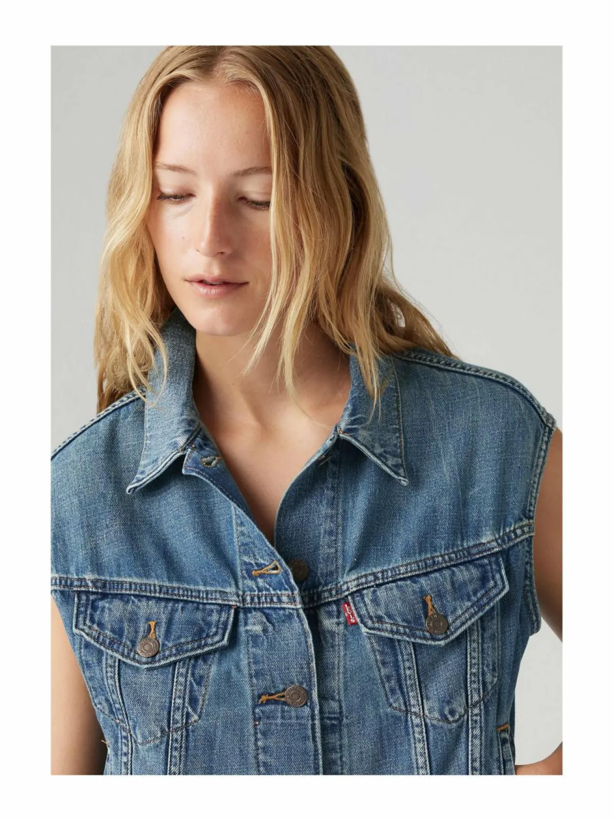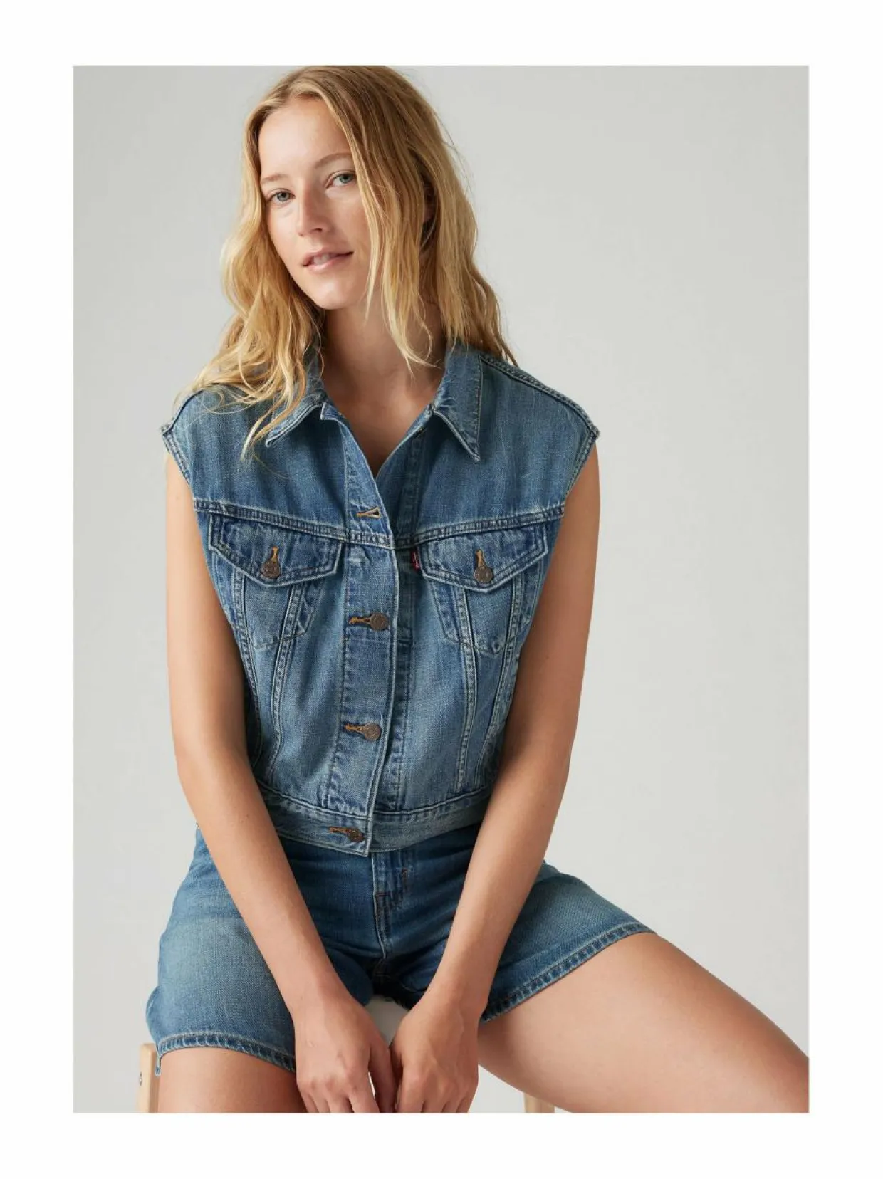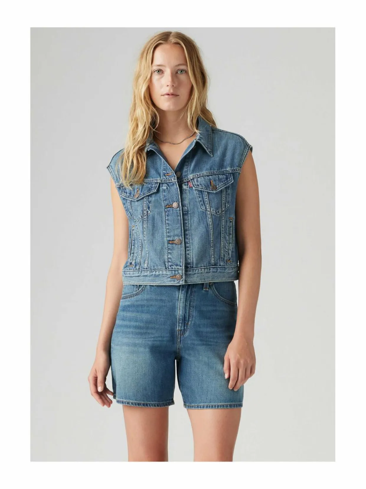 Levi’s Shrunken 90’s -farkkuliivi on ajaton lisäys vaatekaappiisi. Liivissä on klassinen denim-materiaali, joka on valmistettu 85 % puuvillasta ja 15 % pellavasta. Liivissä on nappikiinnitys ja kaksi taskua edessä. Farkkuliivin istuvuus on hieman lyhyempi ja se sopii täydellisesti yhteen farkkujen, hameiden kuin mekkojen kanssa.