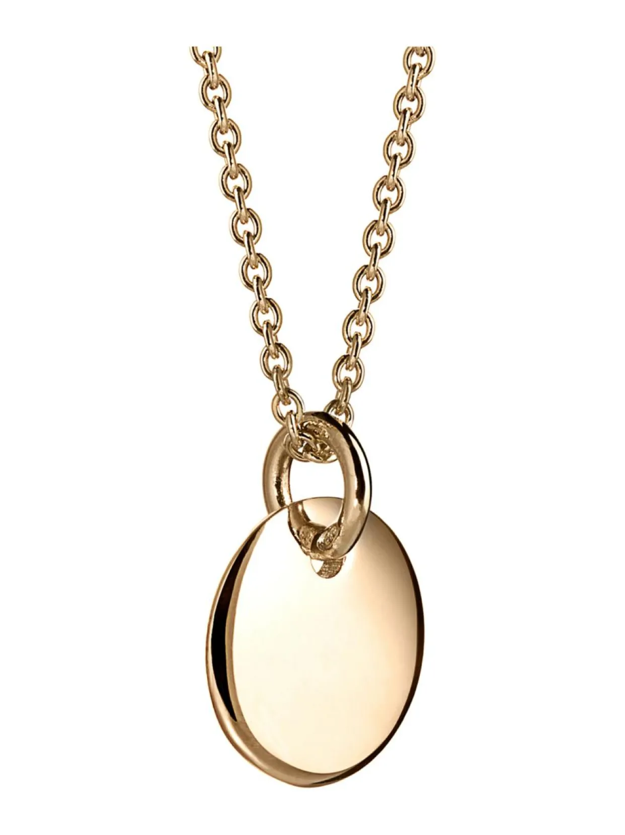 Sileä laattakaulakoru on aina trendikäs klassikko, jonka suosiolle ei näy loppua. Pyöreän laatan halkaisija on 9mm ja se on 14 karaatin kierrätyskultaa. Soikea kiinnityslenkki pitää riipuksen tukevasti kiinni ketjussa.