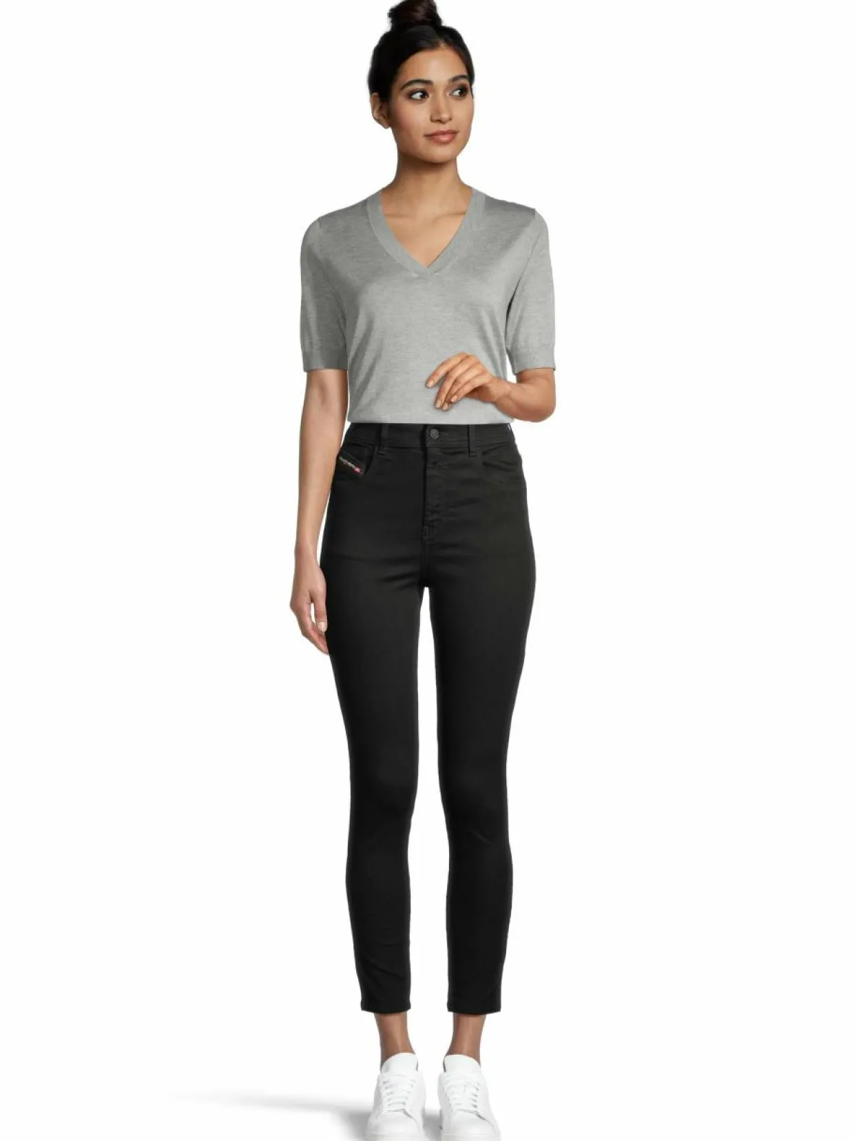 Mukavan korkeavyötäröinen farkkuhousumalli. Lahkeet on muotoiltu kapealla skinny fit -istuvuudella. Edessä nappi- ja vetoketjusepalus. Vyötärökaitaleelta löytyvät vyölenkit. Logomerkki viimeistelee tyylin. Materiaaliin on lisätty myös mukavasti joustoa.