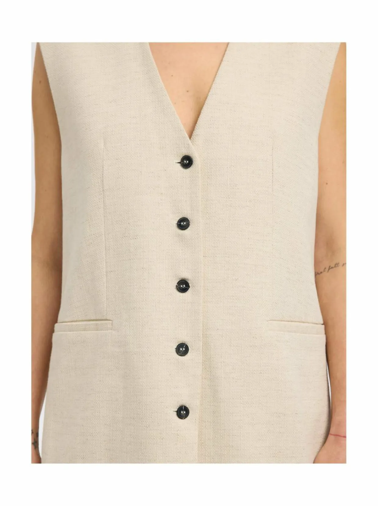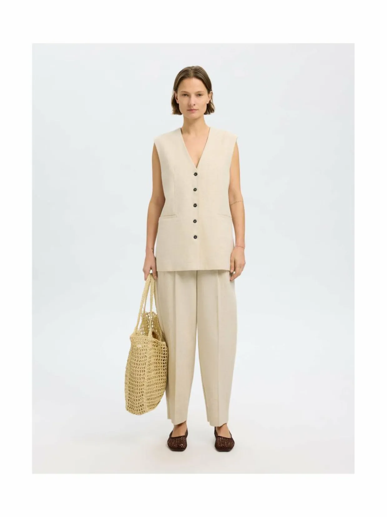 Lantion alapuolelle ulottuva pidempi V-kauluksinen liivi Selected vaatemerkiltä. Pukuliivi sopii käyttöön sellaisenaan tai kerrospukeutumiseen. Materiaalina on käytetty hengittävää ja miellyttävän tuntuista puuvilla-pellavaa. Tuote sisältää vähintään 50 % luomupuuvillaa.