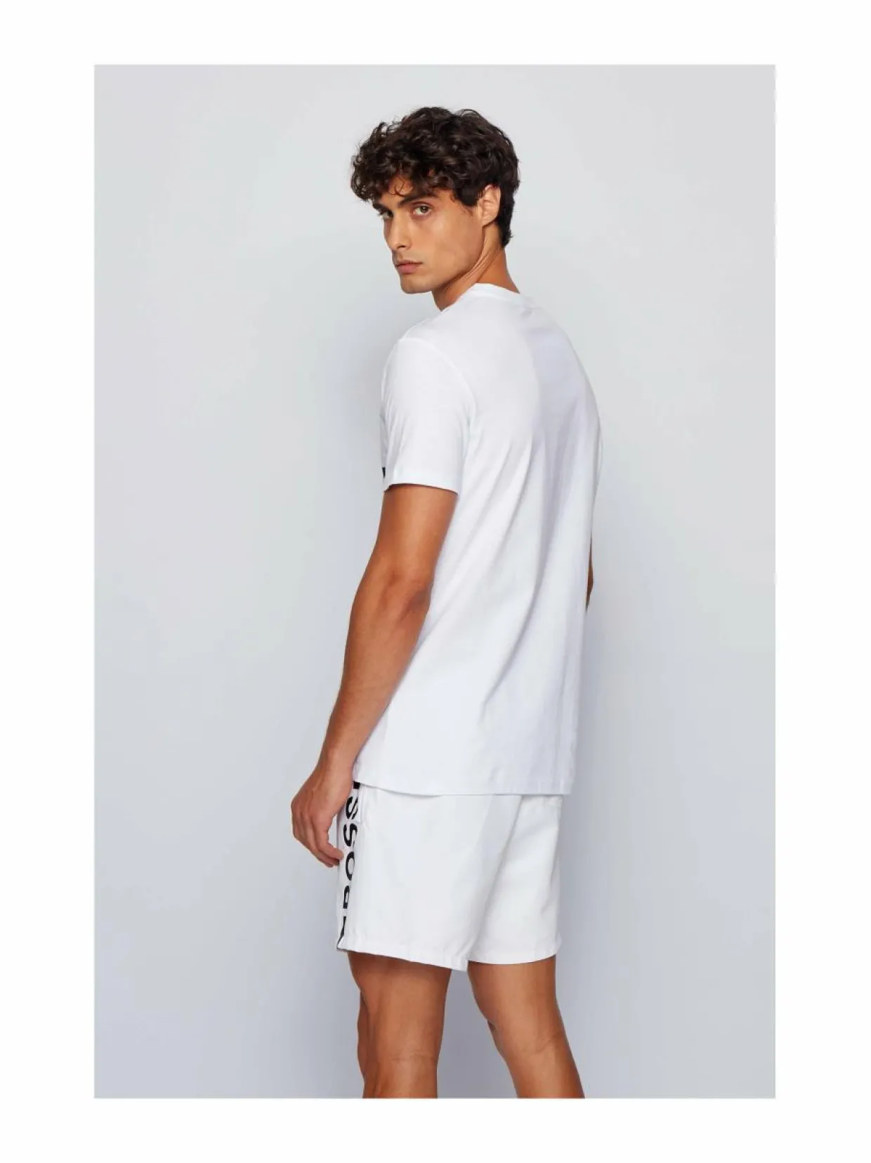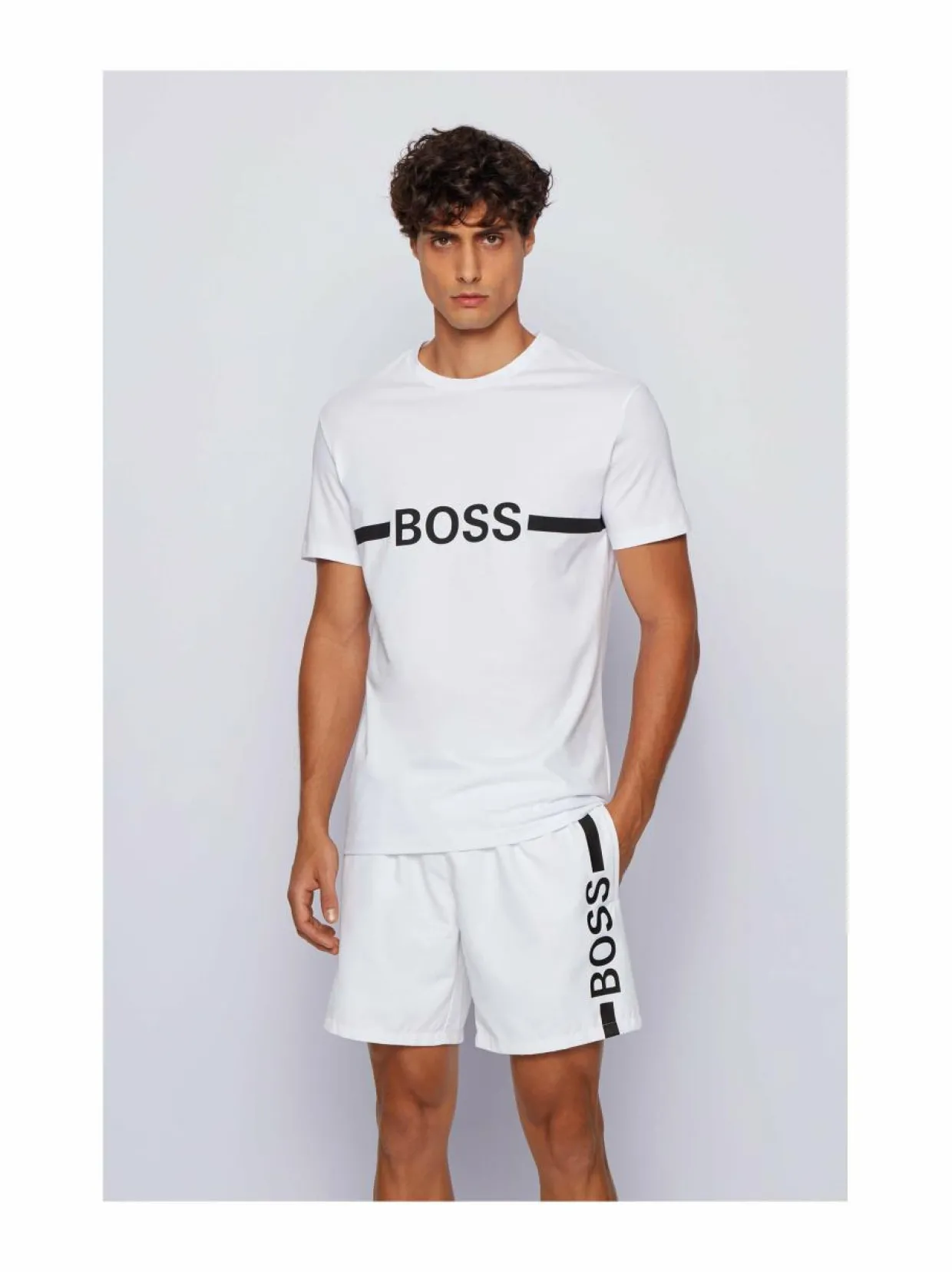 Hugo Bossin kapealinjaisessa t-paidassa on näyttävä logopainatus rinnassa. Puuvillapaita suojaa UV-säteilyltä, aurinkosuojakerroin UPF (Ultraviolet Protection Factor) on 50+.