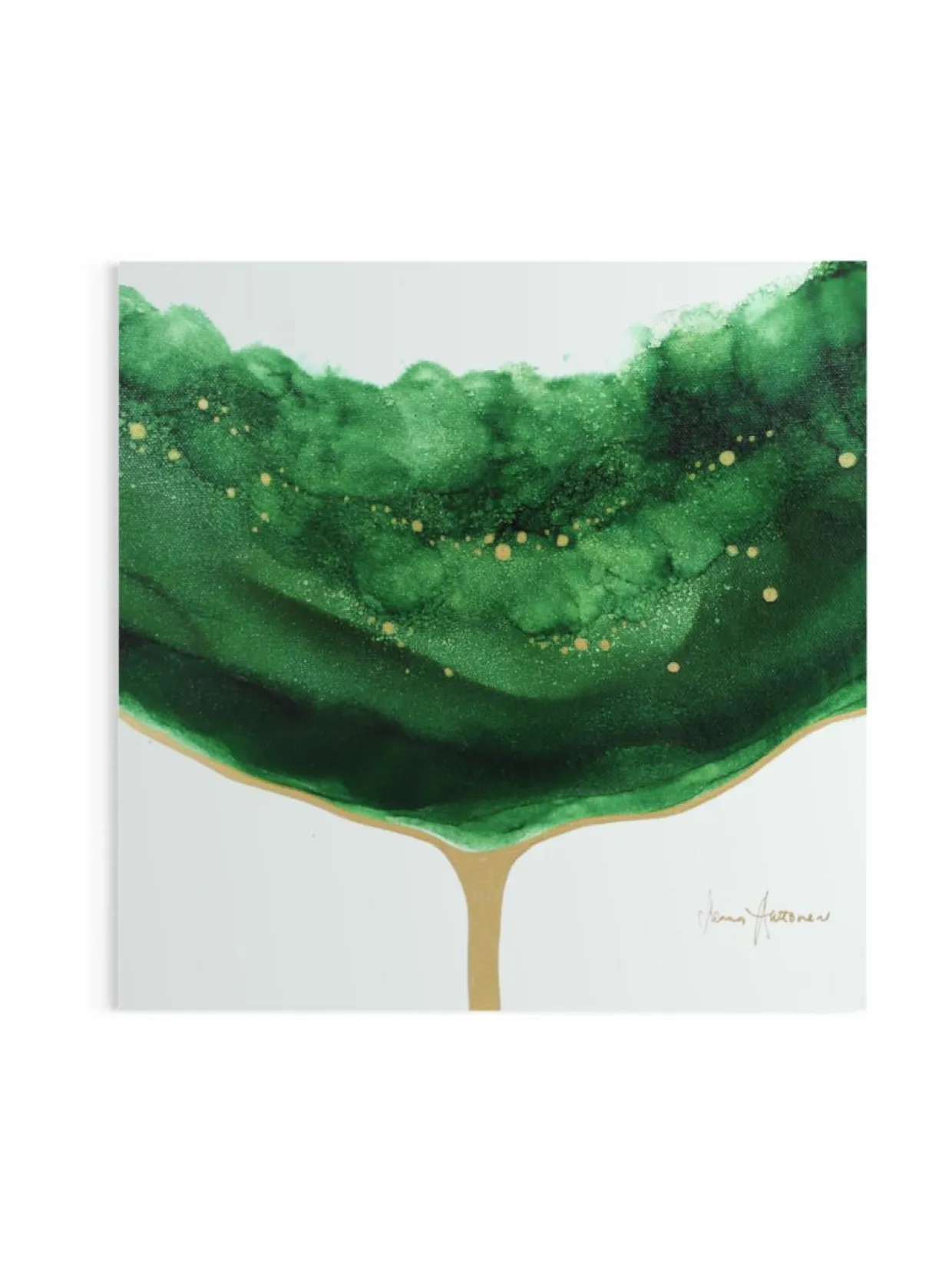 Abstrakti FREESIA-kukka on saanut inspiraationsa pohjoisen luonnosta. Taideteos on toteutettu vihreää alkoholimustetta puhaltamalla. Raikas ilme on viimeistelty kullansävyisillä yksityiskohdilla.
