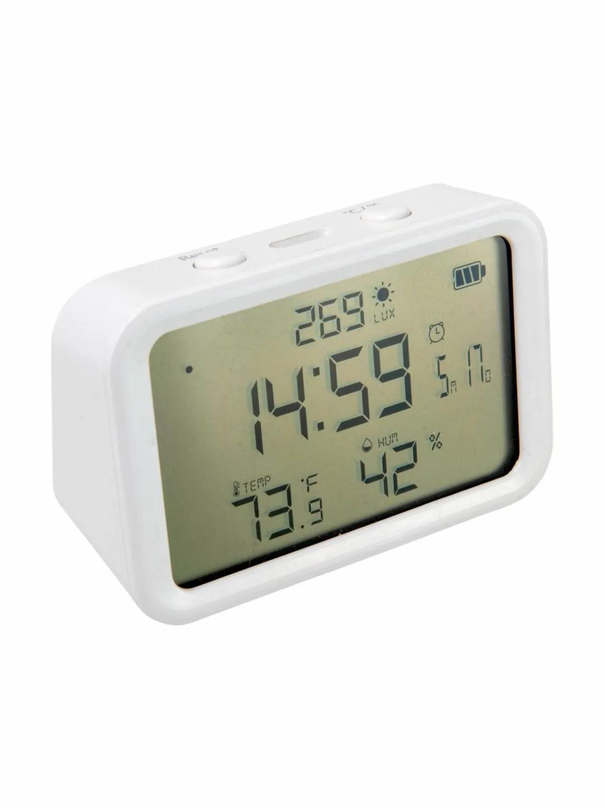 Airam SmartHome -lämpötila- ja kosteusmittari on kätevä laite, joka mittaa huoneen lämpötilan, kosteuden ja valaistuksen tason. Laitteen avulla voit seurata kodin olosuhteita ja luoda sääntöjä muiden SmartHome-tuotteiden välille. Voit esimerkiksi ohjata valoja sammumaan, kun valaistustaso laskee, tai lämmittimen käynnistymään, kun lämpötila laskee.