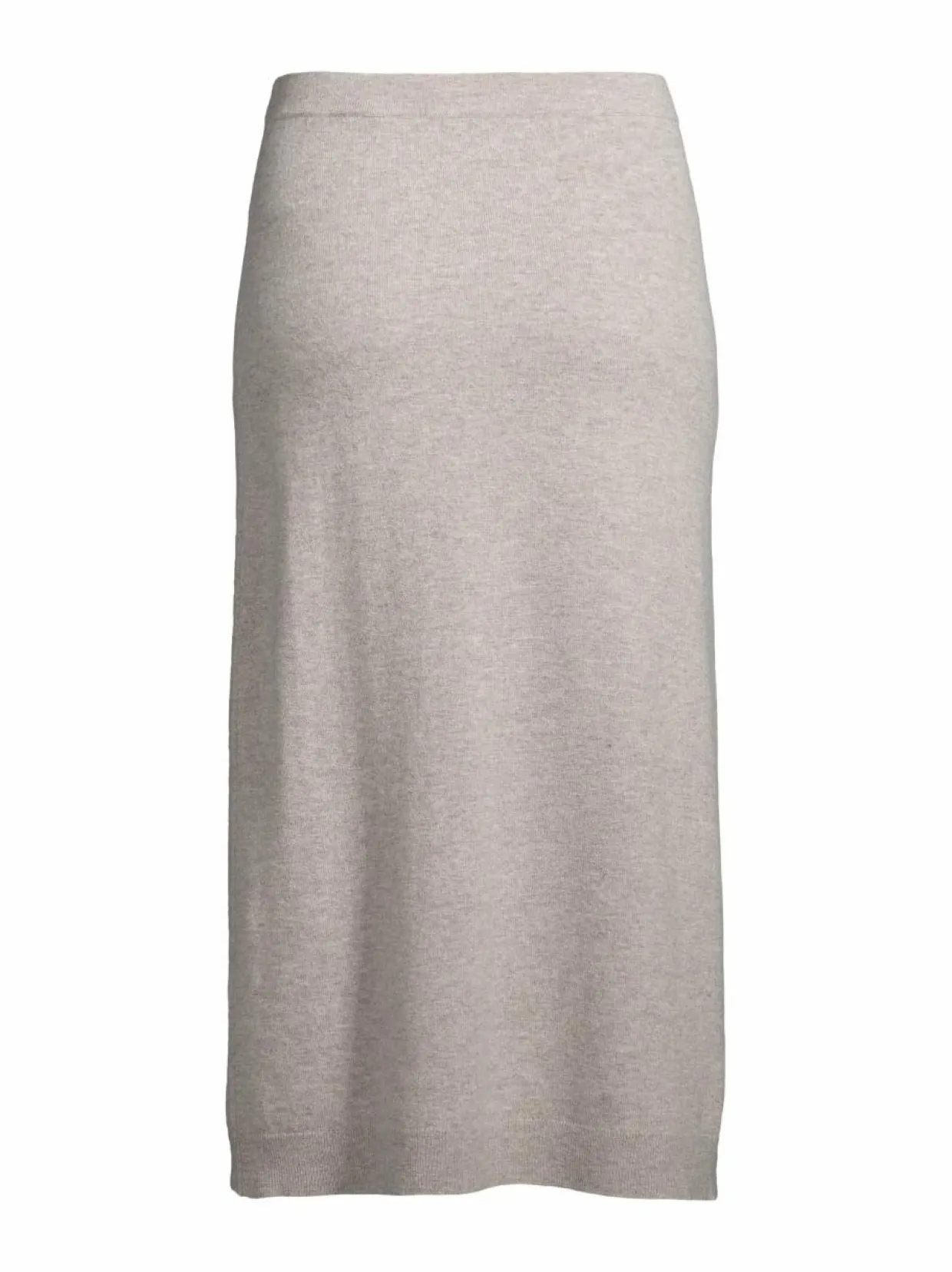 Suoralinjaisen selkeä, sileäneuloksinen hame, jossa on joustava vyötärökaitale. Materiaalina on laadukas ja pehmeä villa-kashmirsekoite. Tämän pohjepituisen hameen takapituus on 80 cm koossa M.