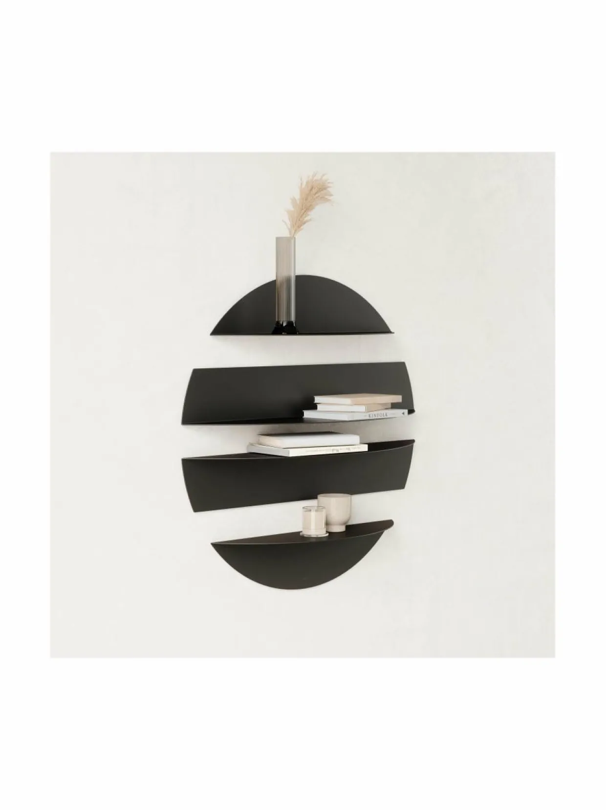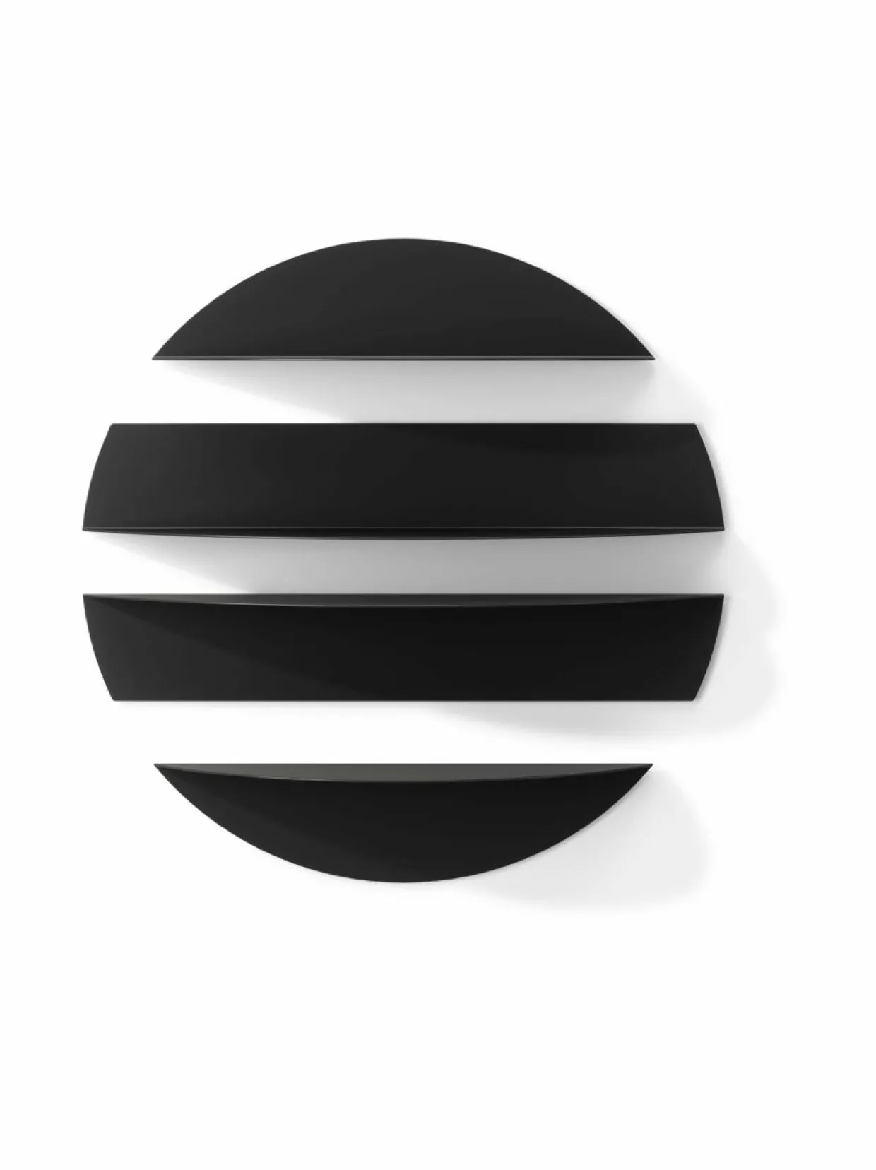 Tämä Umbran neljän ainutlaatuisen seinähyllyn kokonaisuus on valmistettu taivutetusta metallista, ja niitä voidaan käyttää yhdessä luomaan upea pyöreänmallinen seinäteline, joka toimii myös säilytystilana.Se koostuu kahdesta suuresta ja kahdesta pienemmästä hyllystä, ja jokainen hylly voidaan asentaa erikseen tai sijoittaa yhteen. Jokainen hylly voidaan asentaa myös siten, että hyllypinta on ylöspäin tai alaspäin. Käytä Solis Shelves -seinähyllykkö esittelemään tai säilyttämään kirjoja, koriste-esineitä, kynttilöitä, kuvakehyksiä tai muita tyyliisi sopivia elementtejä.