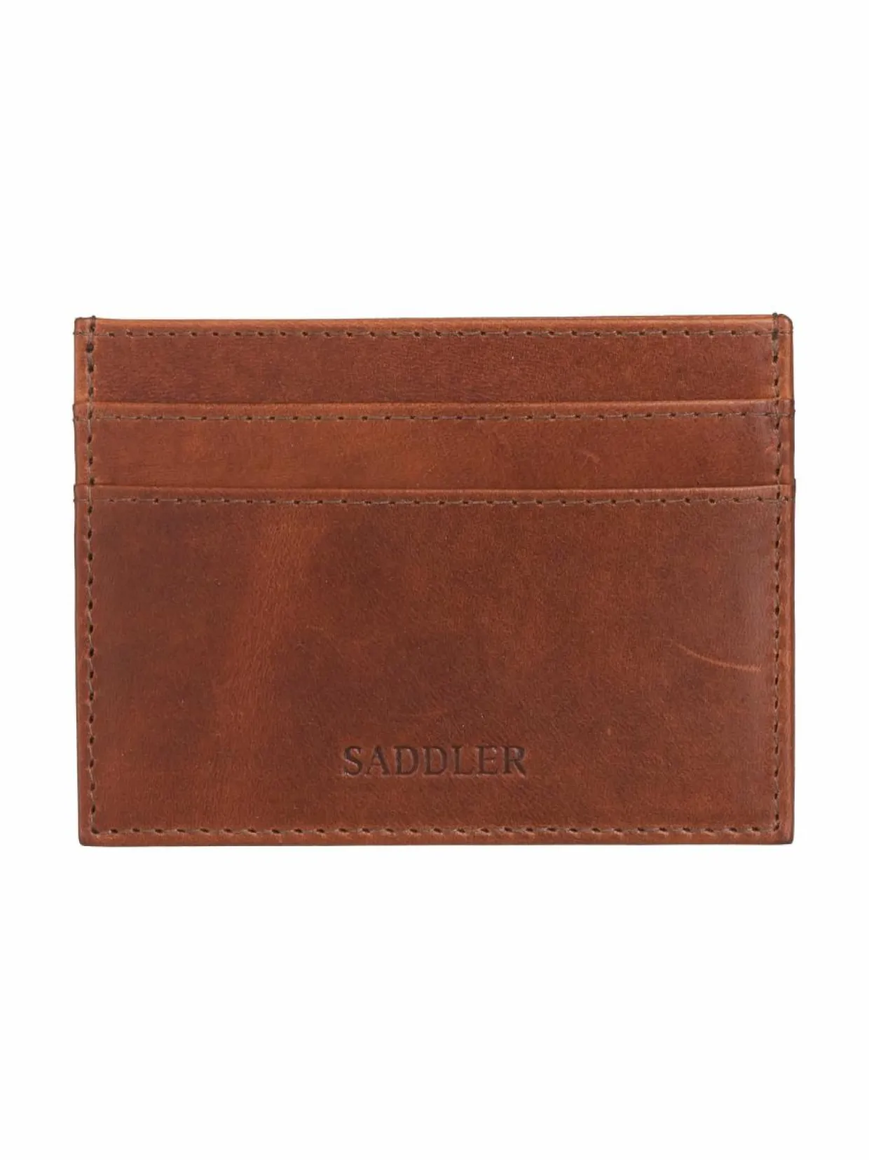 Saddler-korttikotelo on valmistettu pehmeästä ja sileäpintaisesta nahasta. Kotelossa on paikat neljälle kortille sekä yksi isompi tasku esimerkiksi kuiteille tai käteiselle. Kotelon etuosaa koristaa nahkaan painettu logoteksti.
