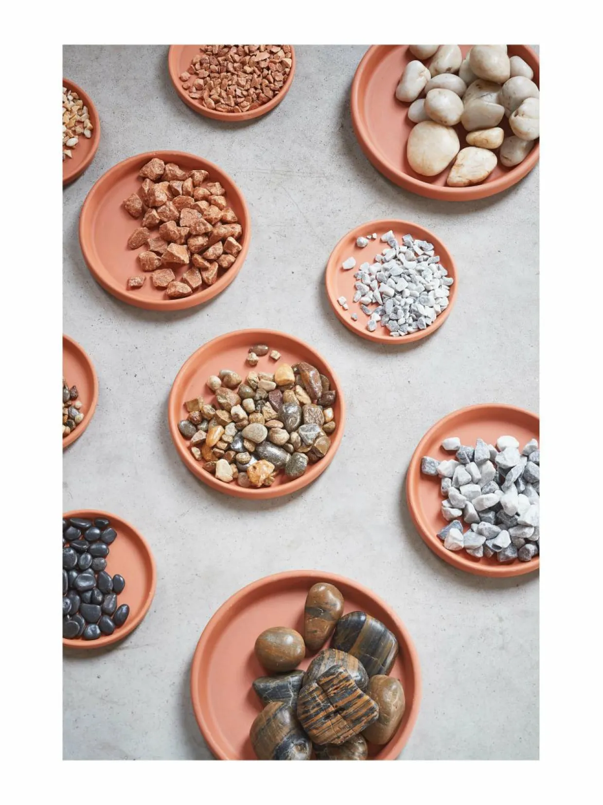 Kukkaruukun aluslautanen luonnonläheisellä tyylillä. Valmistettu terrakottakeramiikasta.