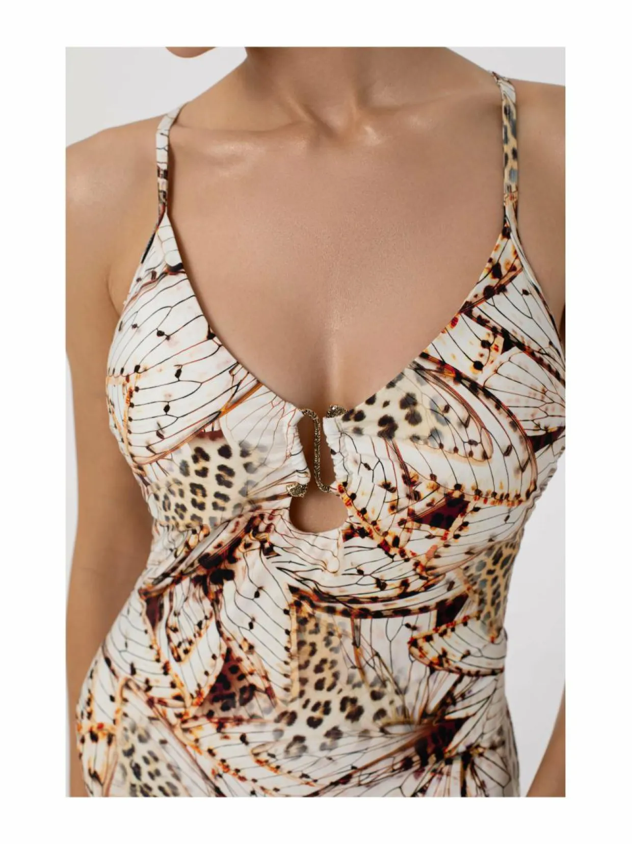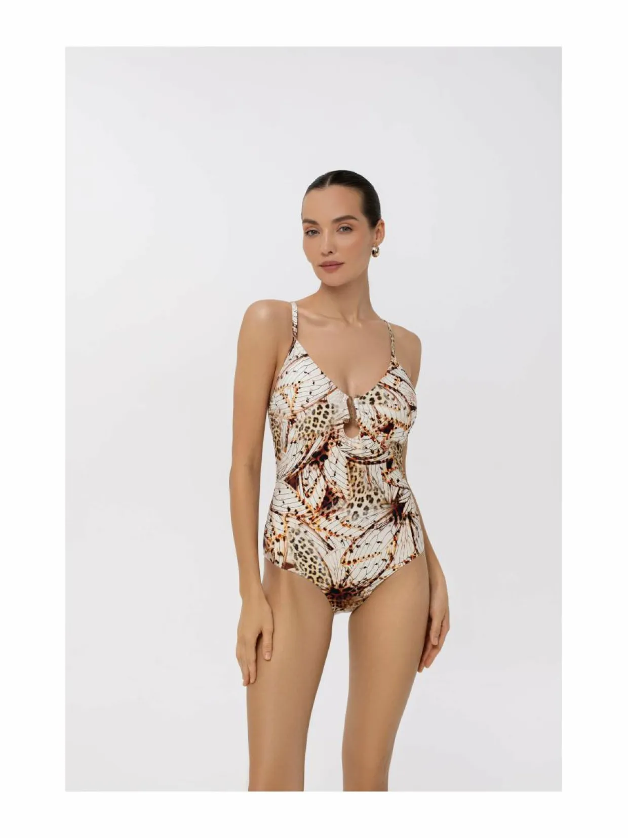 Marc & Andrén kaarituettomassa Stay Wild -uimapuvussa on edessä V-mallinen ja takana selän paljastava leikkaus. Olkaimet ovat säädettävät. Uimapukua koristaa eloisa printti sekä metallinen koriste edessä. Malli on kokonaan vuorattu ja sen lahkeensuiden leveys on normaali.