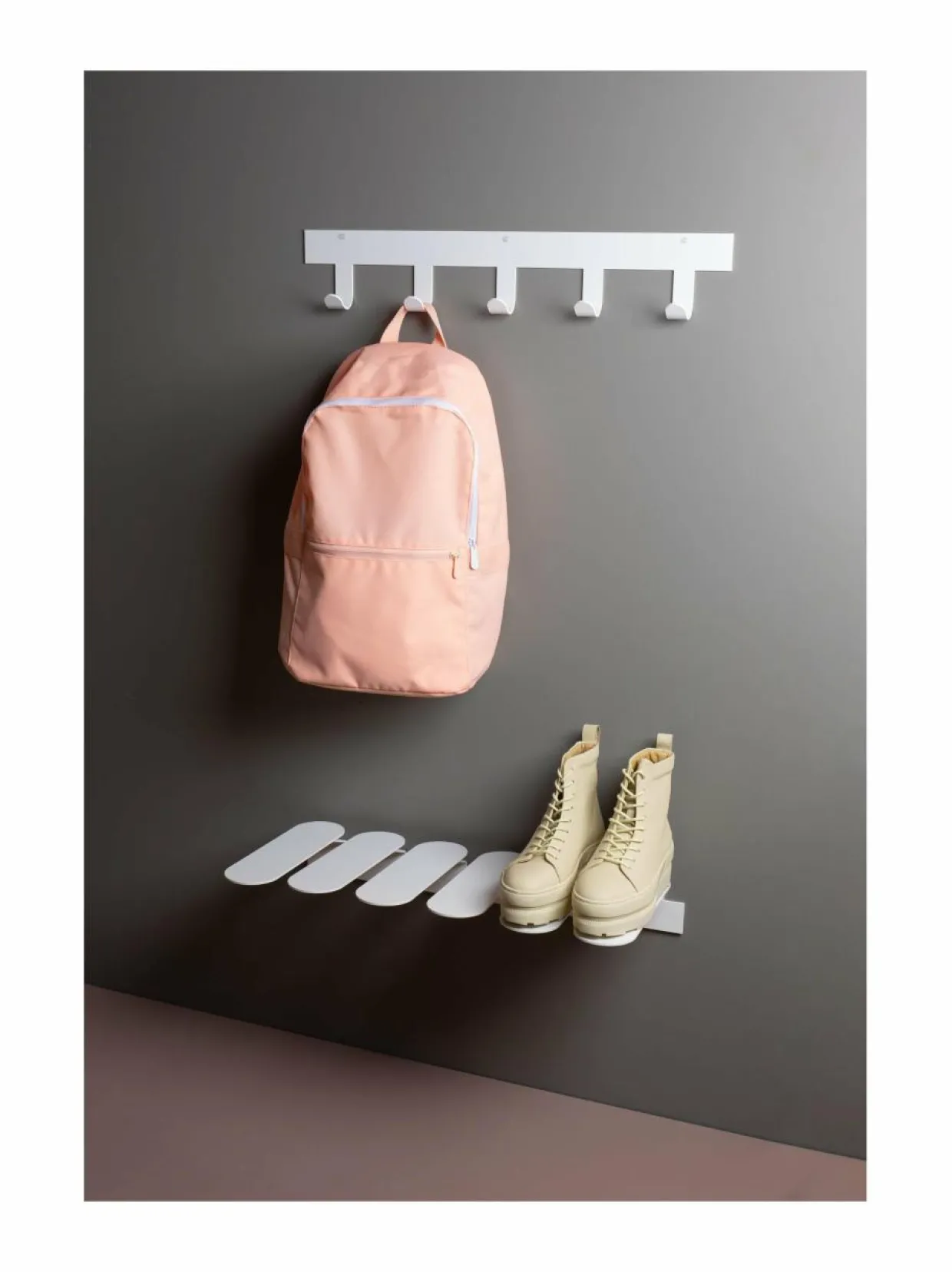 Mazen Step-kenkäteline on pelkistetty, hienoiseen kulmaan muotoiltu teline, jossa on kengänpohjankokoisia metallilaattoja, joille kengät asetellaan. Pieni kulma asettaa kengät paremmin esille ja kengät saavat hyvin myös tuulettua päivän käytön jälkeen.