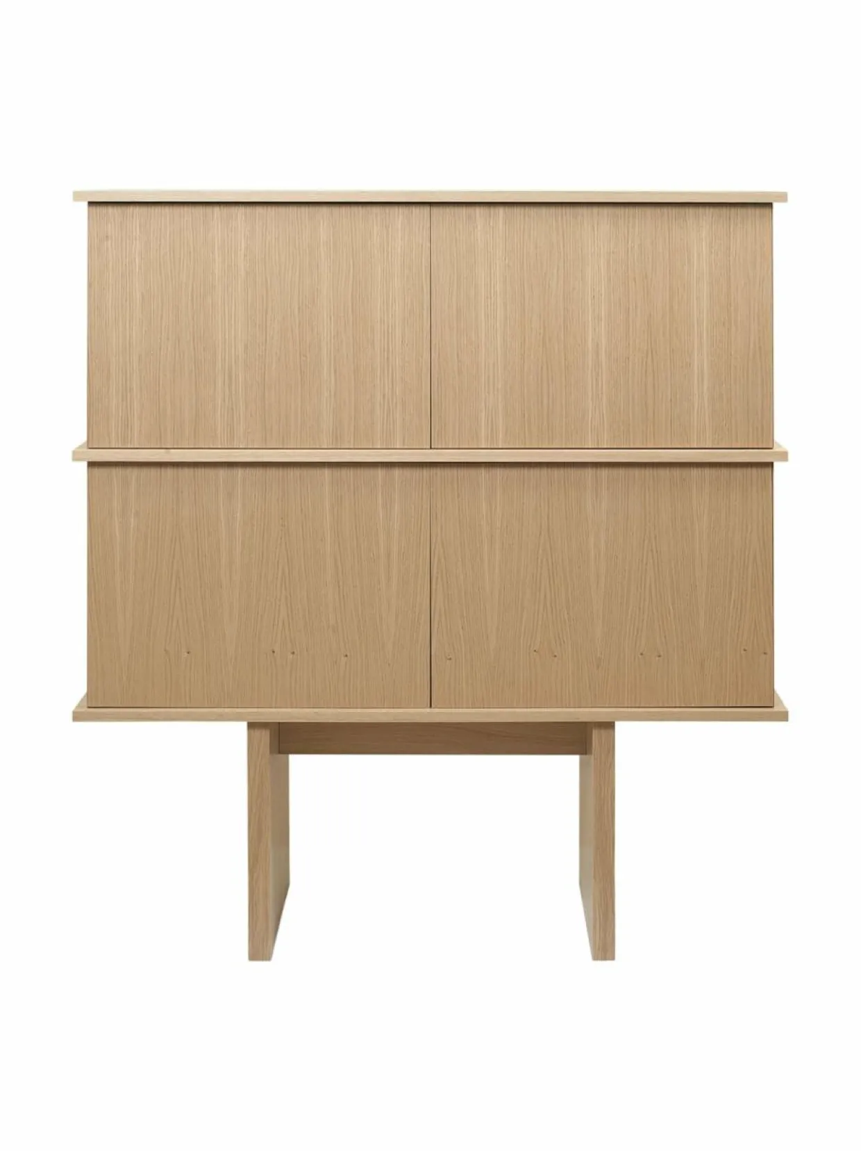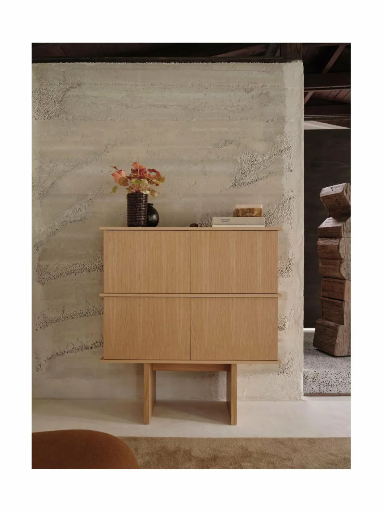 Ferm LIVINGin Stilt-senkki tekee vaikutuksen kevyellä ja ilmavalla muotoilullaan, joka on saanut inspiraationsa arkkitehtonisista pilareista, jotka nostavat rakenteita maan tai veden yläpuolelle. Sertifioidusta tammiviilusta valmistettujen ovien takana senkki tarjoaa runsaasti säilytystilaa astioille, vaatteille, kodintekstiileille – tai muille tärkeille tavaroille, jotka haluat laittaa sinne. Senkki on varustettu siroilla jaloilla, jotka antavat säilytyskalusteelle omaleimaiset ja kiehtovat mittasuhteet, tarjoten samalla kiinnostavan visuaalisen sisustuselementin tilaan kuin tilaan.
