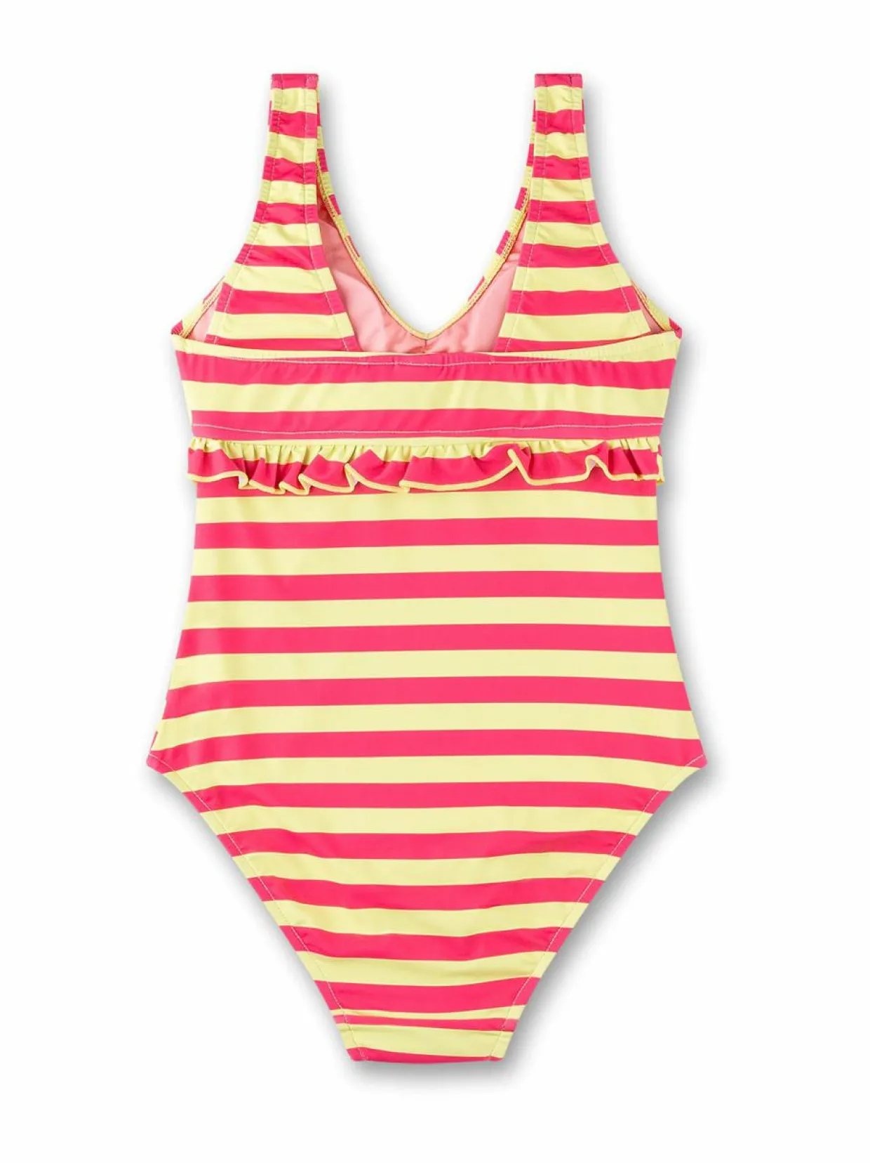 Sanetta-merkin uimapuku on valmistettu pehmeästä ja joustavasta materiaalista, joka sopii erinomaisesti uimiseen ja auringonottoon. Uimapuvussa on raikas raitakuvio ja söpö rusettisomiste edessä. Uimapuvussa on myös muotorypytys rinnassa, joka antaa sille tyylikkään ilmeen. Uimapuvussa on leveät olkaimet, jotka antavat hyvän istuvuuden. Uimapuvun materiaali on polyesteriä ja elastaania. Materiaali on pehmeää ja joustavaa, joten se tuntuu mukavalta iholla. Materiaali on myös nopeasti kuivuvaa, joten uimapuvun voi pukea nopeasti uinnin jälkeen.