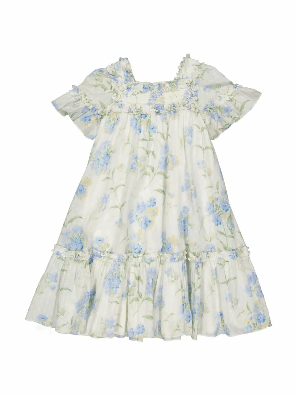 Kaunis mekko vintage-kukkakuviolla, joka on otettu 1930-luvun käsinmaalatusta tapetista. Mekossa on lyhyet hihat, rohkeasti levenevä kerrostettu helma ja kauniit röyhelöt. Mekko on vuorattu. Tuotteen valmistuksessa on käytetty luomupuuvillaa.