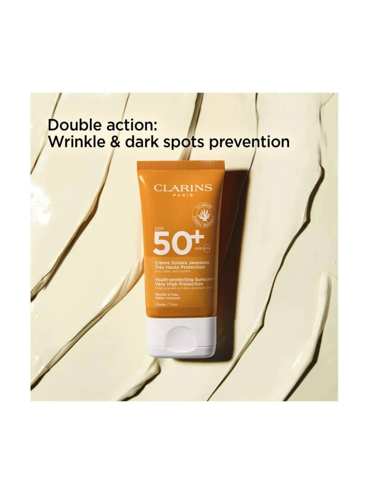 Sun Face Dry Touch Sun Care Cream SPF 50+ -aurinkosuojavoide sisältää erittäin korkean suojan SPF 50+. Voiteen sisältämä kasviperäinen Sun Protect Complex -yhdiste suojaa ihoa auringon UVA- ja UVB-säteiden lisäksi myös sinisen valon haitallisilta vaikutuksilta. Luomukaakaouute ja E-vitamiini antavat iholle antioksidanttisen suojan ihon ennenaikaisten ikääntymisen merkkien muodostumista vastaan.Hikoilun ja vedenkestävä koostumus on hellävarainen, eikä se jätä iholle rasvaista, tahmeaa tunnetta. Kaikille ihotyypeille, myös herkälle iholle.Edistyksellistä suojaa antavissa Clarins Suncare-aurinkosuojatuotteissa yhdistyvät korkea suojakerroin, miellyttävä käyttökokemus sekä läpikuultava ja tahmaamaton koostumus.Aurinkosuojatuotteissa on vesistöjä kunnioittavat vihreät koostumukset ja 100 % kierrätettävät pakkaukset.