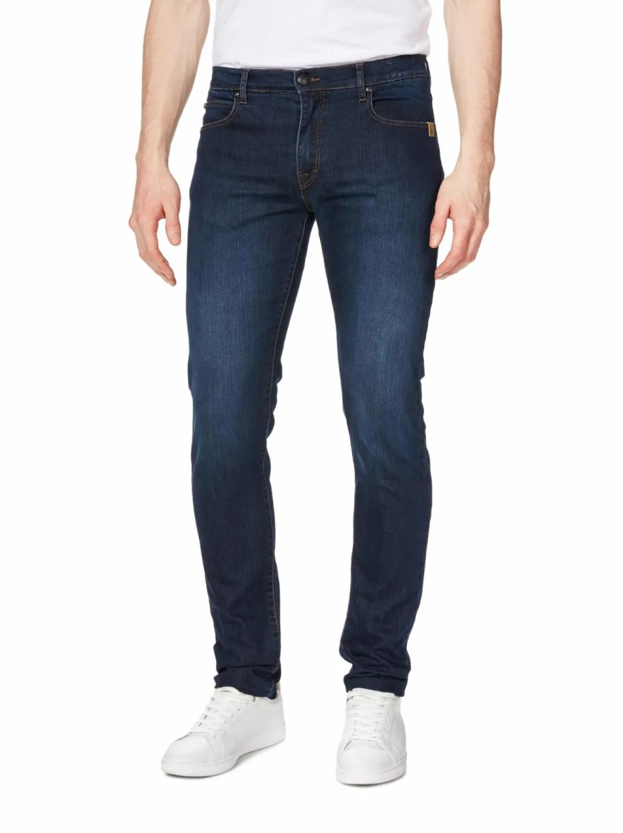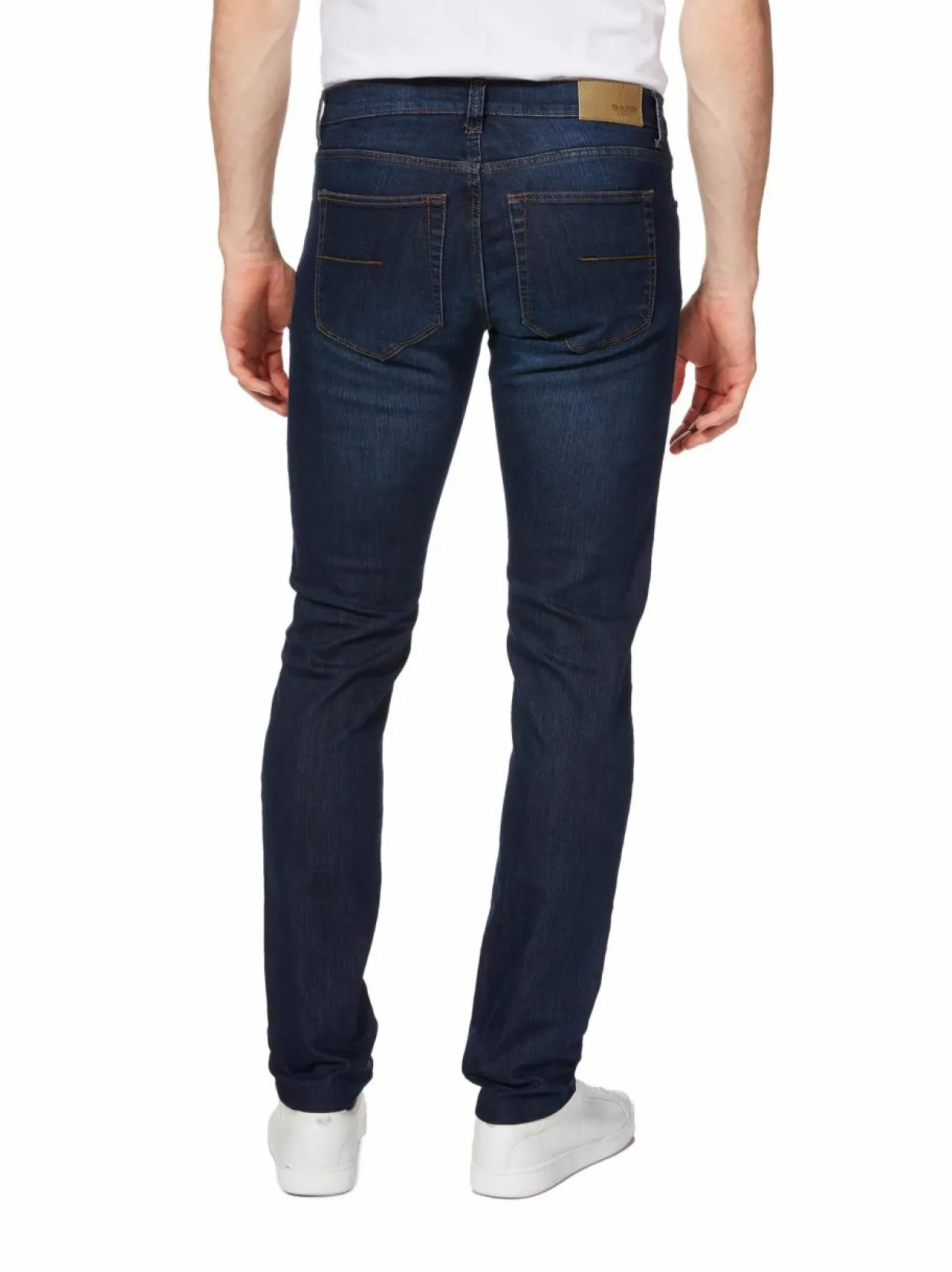SAND Copenhagenin viisitaskufarkkujen joustava denimmateriaali tuntuu mukavalta yllä. Housuissa on aavistuksen verran kapenevat lahkeet ja etuhalkiossa vetoketju ja nappi. Takataskuissa on hillityt vaakatikkaukset. Mitoitukseltaan farkut ovat slim fit.