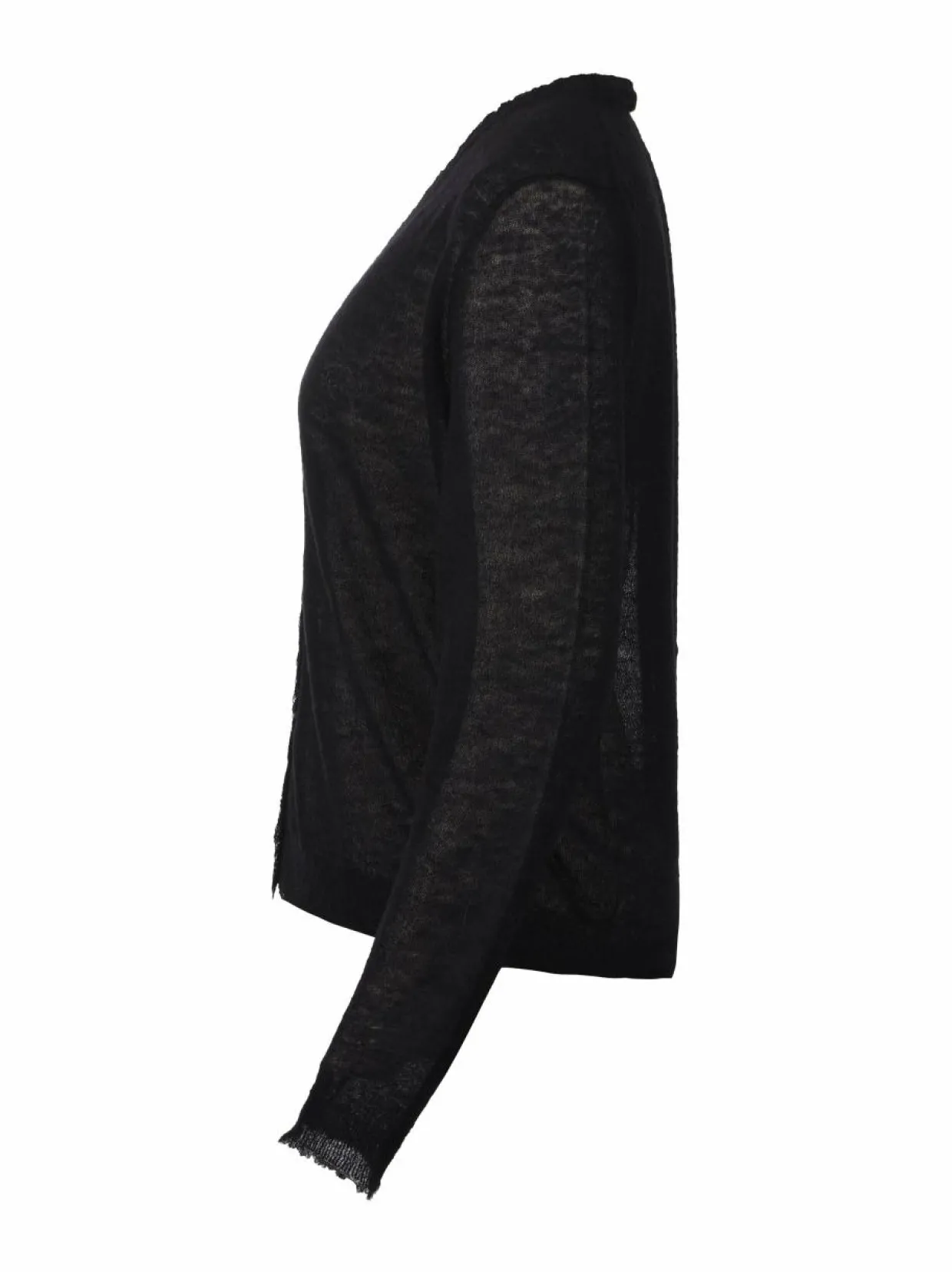Ohuen ohut ja pehmeä neuletakki villa-mohairsekoitteesta. Kauniit helmiäisnapit koristavat etulistaa. Hihansuut ja helma ovat ribbineulosta, jota pehmentävät raakareunat. Takapituus on 52 cm koossa M.