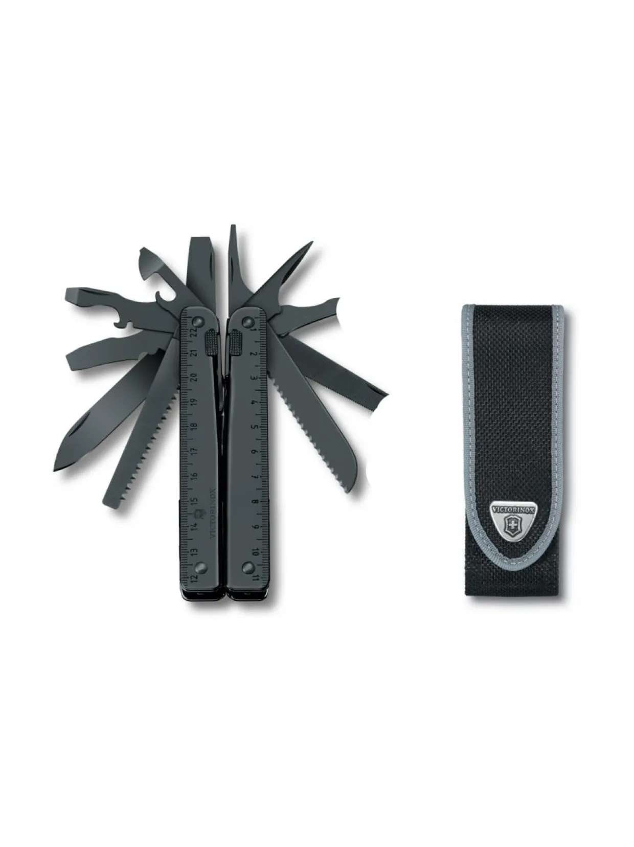 Järeä monitoimityökalu ammattimaiseen käyttöön. SwissToolin kaikki terät ovat lukittuvia ja siksi sen käyttö on turvallista. Kaikki terät aukeavat suoraan sivuilta ilman että pihtejä tarvitsee avata. Työkalun musta viimeistely suojaa korroosiolta. Musta suojakerros valmistetaan emäksisellä käsittelyllä, jota kutsutaan oksidoinniksi. Suojaava kerros on vaaraton ihmisille ja eläimille (EC 1935/20049) ja se voidaan puhdistaa käyttöoppaassa olevien ohjeiden mukaisesti.