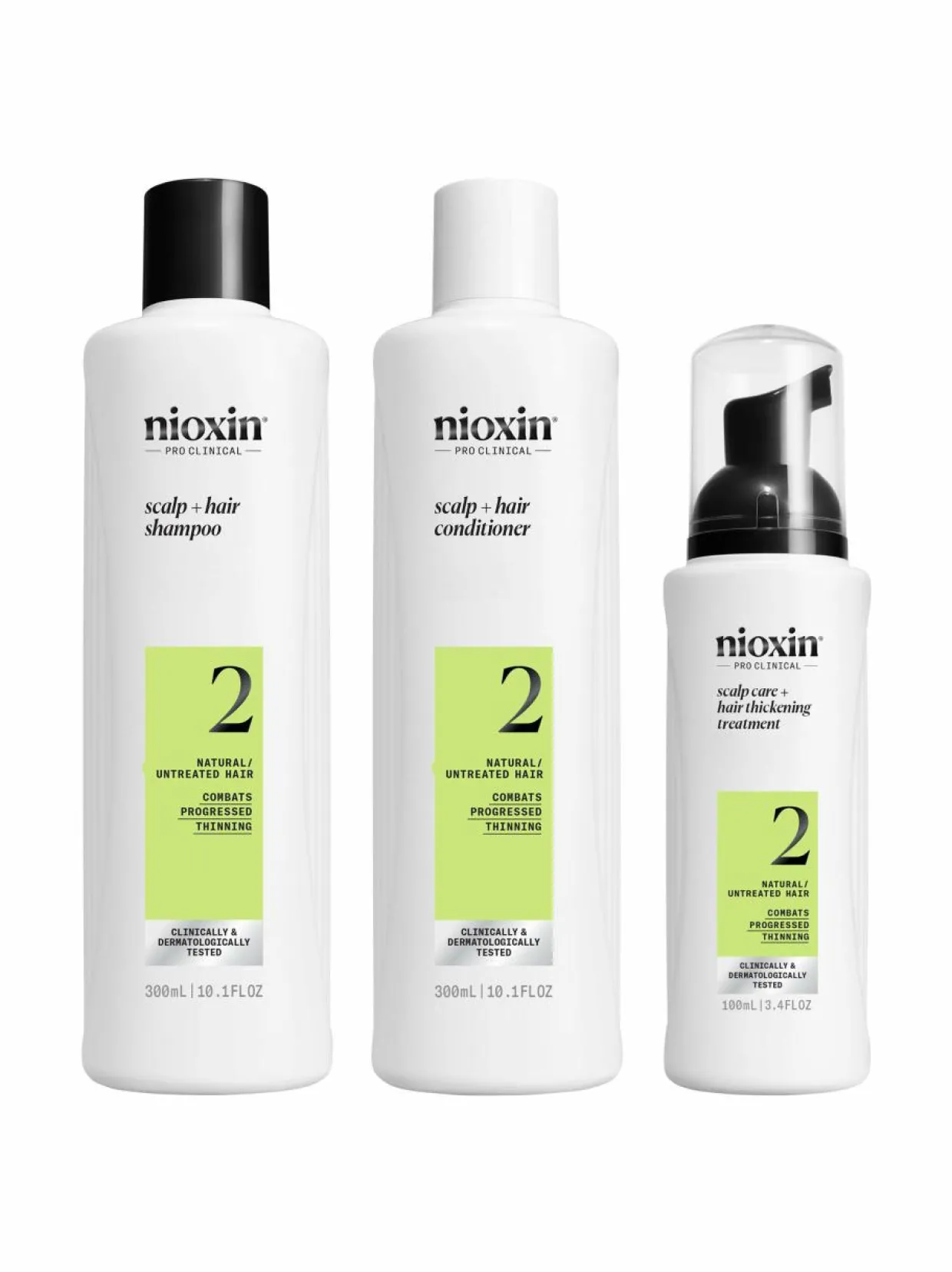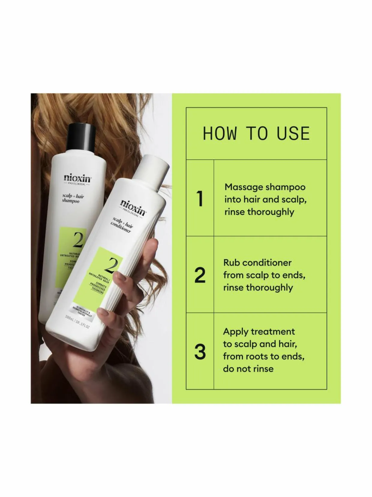 Ainutlaatuinen kolmen hiustenhoitotuotteen setti on kehitetty erityisesti tuuhentamaan hiuksia. Nioxin System 2 raikastaa hiuspohjaa, vähentää katkeilun aiheuttamaa hiustenlähtöä, vahvistaa hiuksia ja antaa tervettä kiiltoa.- Nioxin Cleanser -shampoo poistaa lian, talin ja muut ympäristöjäämät hiuspohjasta ja hiuksista.