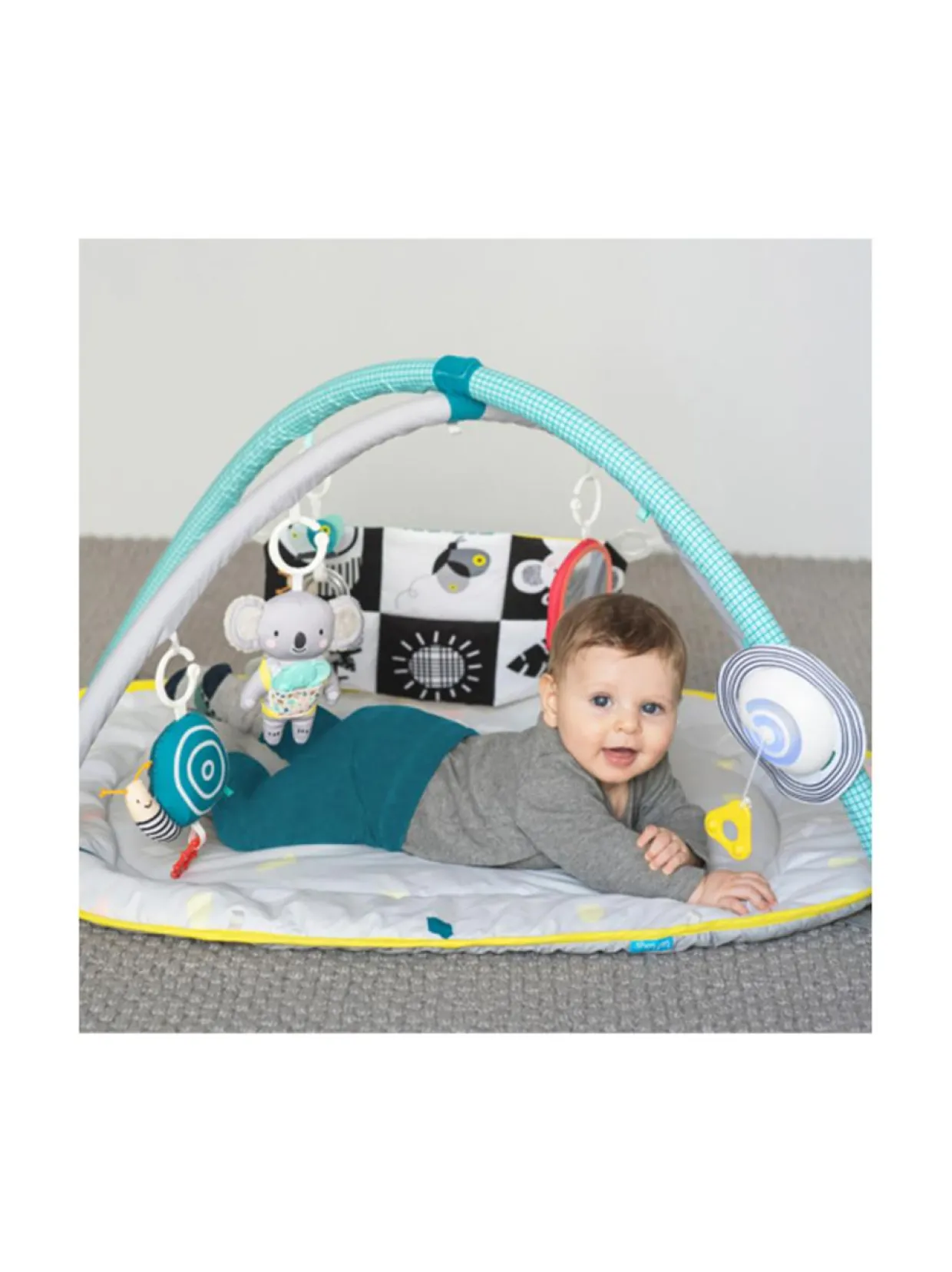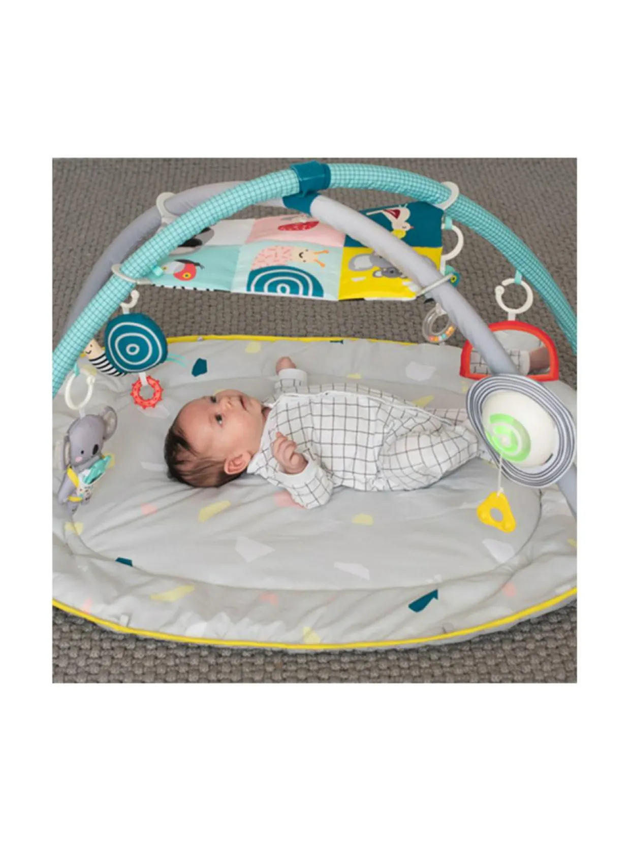 Taf Toys leikkimatto All Around Me Gym on monipuolinen ja värikäs leikkimatto, johon kuuluu leikkimatto irrotettavilla kaarilla ja lukuisia irrotettavia leluja. Näitä on muun muassa rätinäkankainen kaksipuoleinen seinäpaneeli, vauvaturvallinen peili, koala purulelulla, ja helistin. Leikkimaton mukana tulee musiikkimobile, jossa on valo. Valo muuttaa väriä musiikin tahdissa. Mobilessa on kolme melodiaa, jonka tyylin voi valita tilanteeseen sopivaksi.